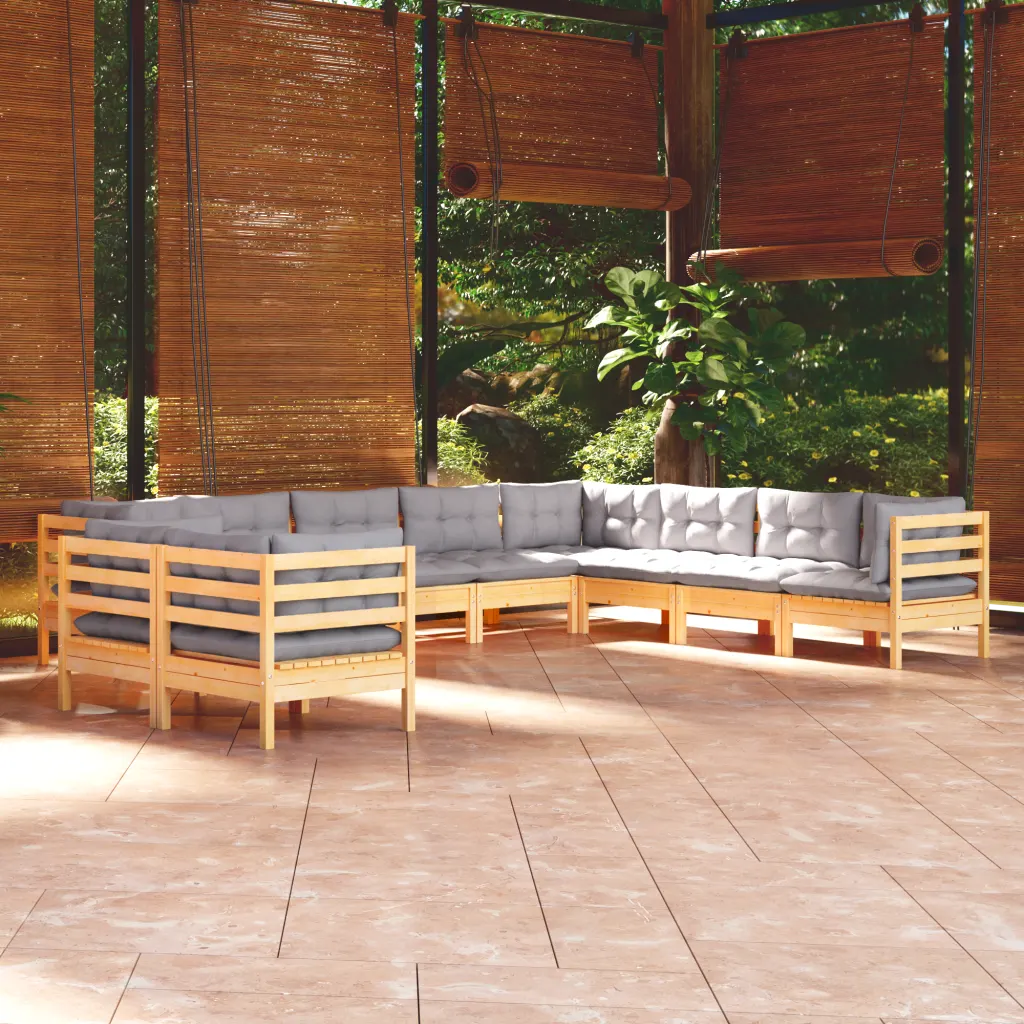 See 10-osaline männipuidust aiadiivanikomplekt aitab luua terrassile, aeda või talveaeda avara ja hubase istumisala pere ja sõpradega aja veetmiseks. Modulaarne lahendus võimaldab mooduleid vastavalt ruumile ümber paigutada, olgu sooviks pikk sirge diivan või nurga- ja U-kujuline lahendus. Hallid pehmed padjad lisavad istumismugavust ja loovad modernse, neutraalse ilme, mis sobitub erinevate väliruumidega.