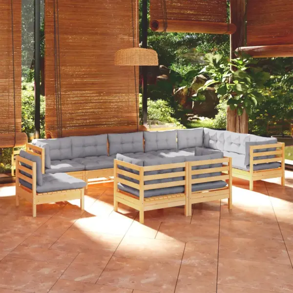 See 10-osaline männipuidust aiamööbli komplekt loob avara ja mugava istumisala aeda või terrassile. Tugevast männipuidust raam ja pehmed hallid polüesterpadjad pakuvad hubast kohta lõõgastumiseks, ilma nautimiseks ning pere ja sõpradega aja veetmiseks.