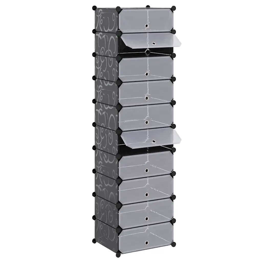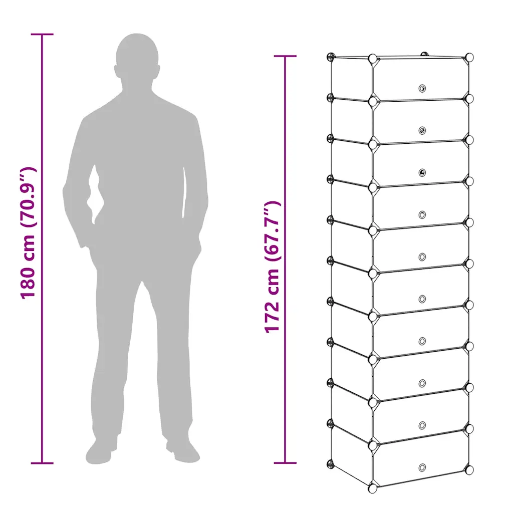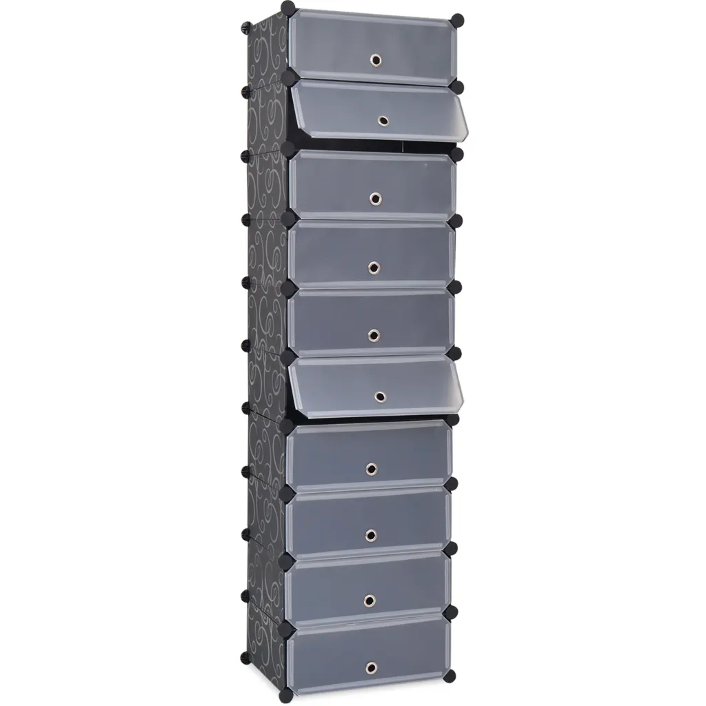 10-sektsiooniga jalatsikapp aitab hoida kogu pere jalanõud ühes kohas, kaitstuna tolmu eest ja kergesti leitavana. Kapp on valmistatud must-valgetest plastpaneelidest terasraamiga, mis muudab selle kergeks, kuid samas stabiilseks. Tänu kompaktsetele mõõtudele 47 x 37 x 172 cm sobib see hästi ka väikestesse esikutesse või garderoobidesse.