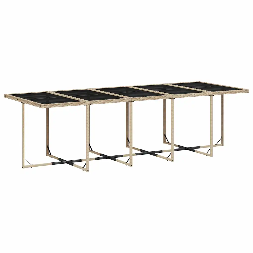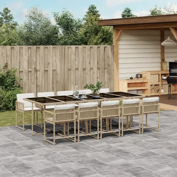 See 11-osaline aiamööblikomplekt pakub avarat istumisala kuni kümnele inimesele, sobides hästi terrassile, aeda või hoovi. UV-kindlast polürotangist valmistatud laud ja toolid on loodud välitingimustes kasutamiseks ning tihkelt polsterdatud eemaldatavate patjadega istmed muudavad pikad õhtusöögid ja koosviibimised mugavaks.