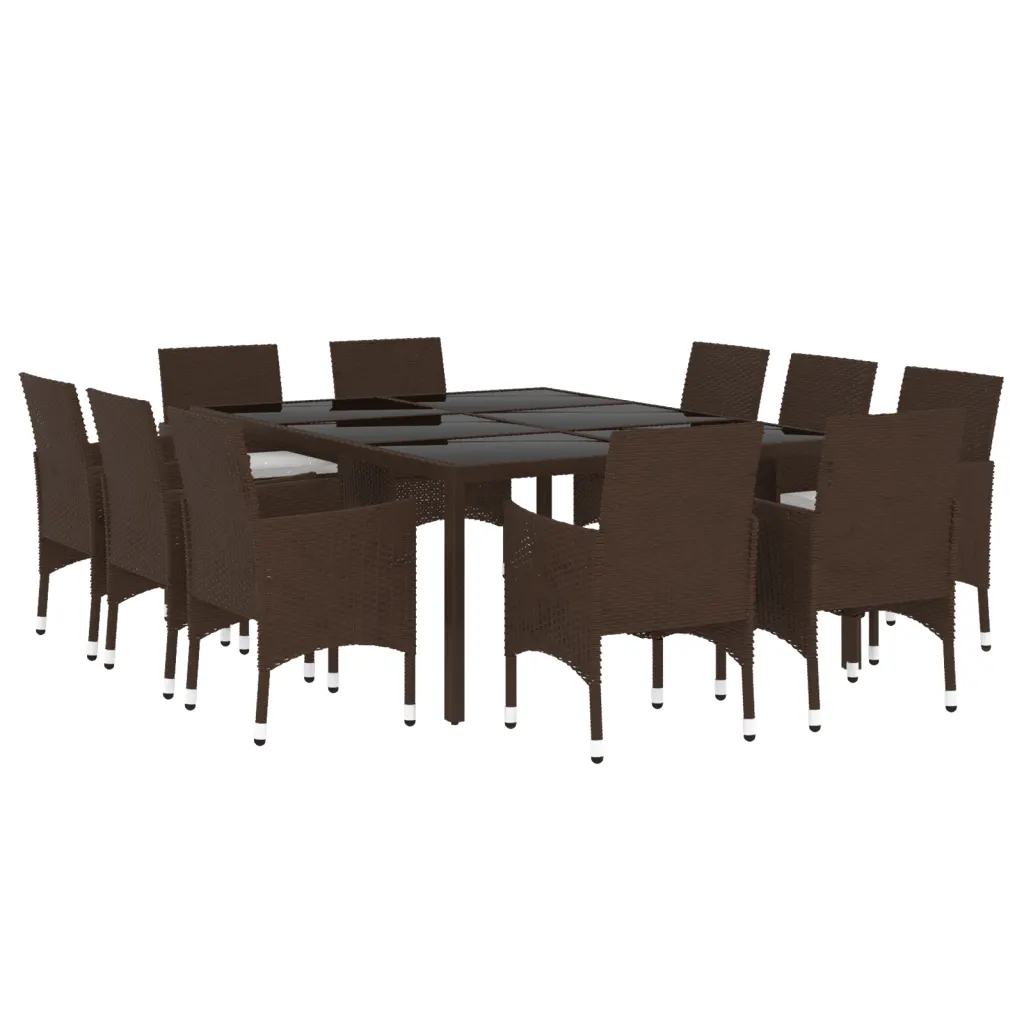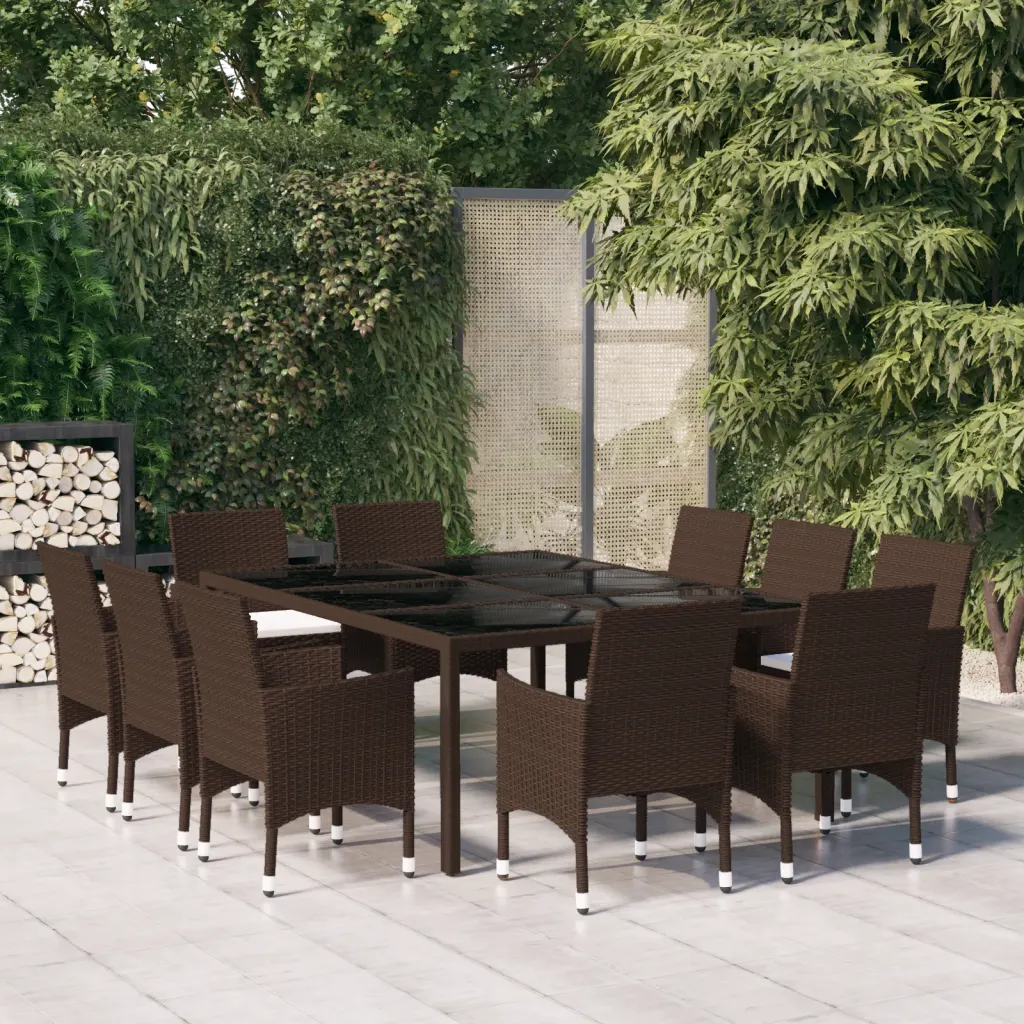 See 11-osaline aiamööbli komplekt loob aeda või terrassile mugava koha pereõhtusöökideks ja sõprade võõrustamiseks. Suur laud mõõtmetega 200 x 150 cm ja kümme käetugedega tooli pakuvad rohkelt istekohti, ilmastikukindel pruun polürotang ning pulbervärvitud terasraam tagavad vastupidavuse eri ilmaoludes.