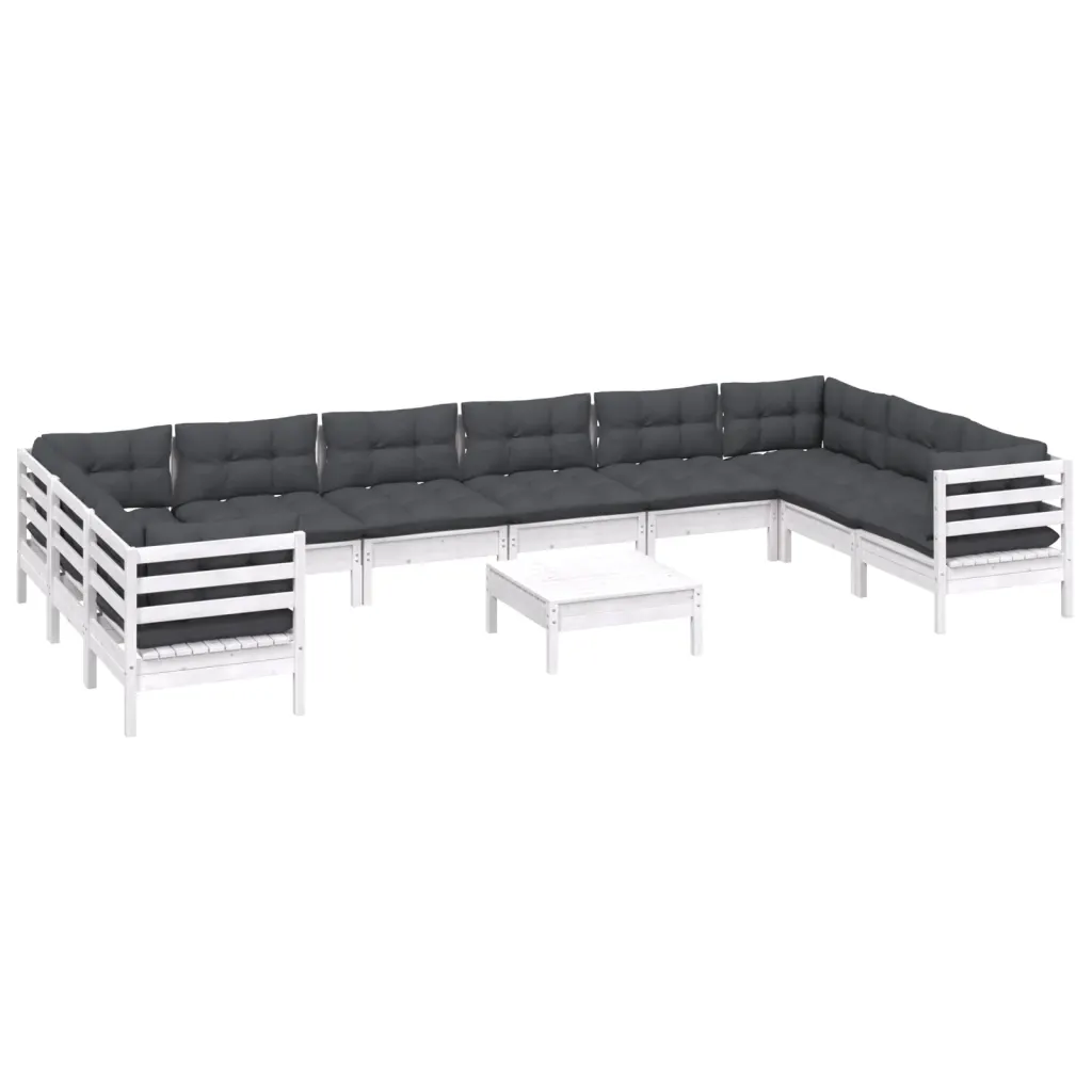 See 11-osaline valge täismännipuidust aiamööbli komplekt loob ruumika istumisala terrassile või aeda pere ja sõpradega aja veetmiseks. Tugev puidust konstruktsioon on stabiilne ja vastupidav igapäevasele kasutusele, samal ajal kui pehmed antratsiithallid padjad pakuvad mugavat istumiskogemust pikkadeks õhtuteks värskes õhus.