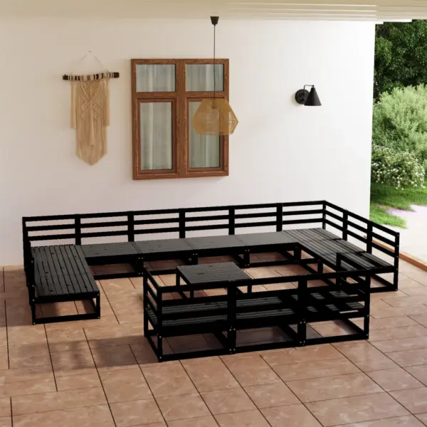 See 14-osaline modulaarne aiadiivanikomplekt loob avara istumisala aeda, terrassile või suurele rõdule. Männipuidust konstruktsioon on tugev ja stabiilne ning must viimistlus sobitub hõlpsasti erinevate välisinterjööridega.