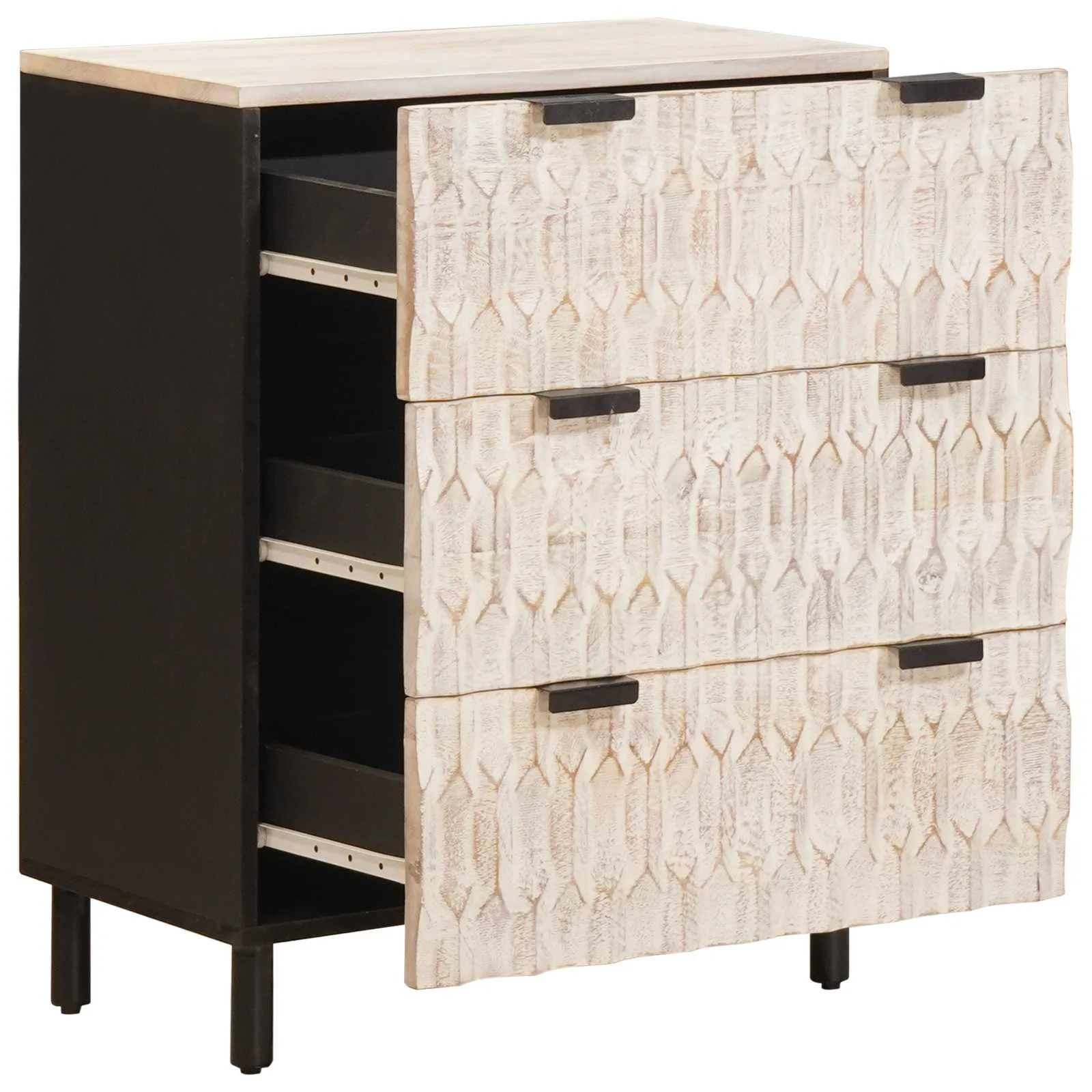 See 2-osaline kummutite komplekt ühendab modernse disaini ja praktilise panipaiga, sobides hästi elutuppa või teistesse eluruumidesse. Valge pesuviimistlus toob esile mangopuidu mustri ja loob kerge, neutraalse ilme, mis sobitub erinevate sisustusstiilidega. Tänu kokku kuuele sahtlile on igapäevaste esemete, raamatute ja dekoratsioonide hoiustamine mugav ja organiseeritud.