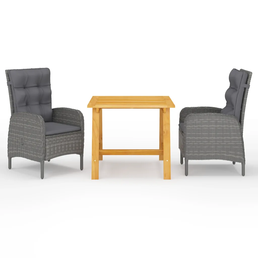 See 3-osaline aiamööbli komplekt aitab luua aeda, terrassile või rõdule kutsuva sööginurga. Õliviimistlusega akaatsiapuidust laud ja hallid polürotangist toolid ühendavad loodusliku välimuse ning lihtsa hoolduse, pakkudes mugavat istumist ka pikemaks õhtusöögiks.