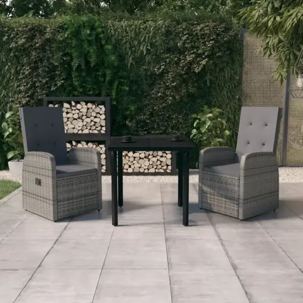 See 3-osaline aiamööbli komplekt loob hubase istumisnurga terrassile, aeda või rõdule, kus nautida einet või lõõgastuda värskes õhus. Halli ja musta tooniga komplekt sobitub kergesti eri stiilis väliruumidega ning pakub mugavat istekohta kahele inimesele.