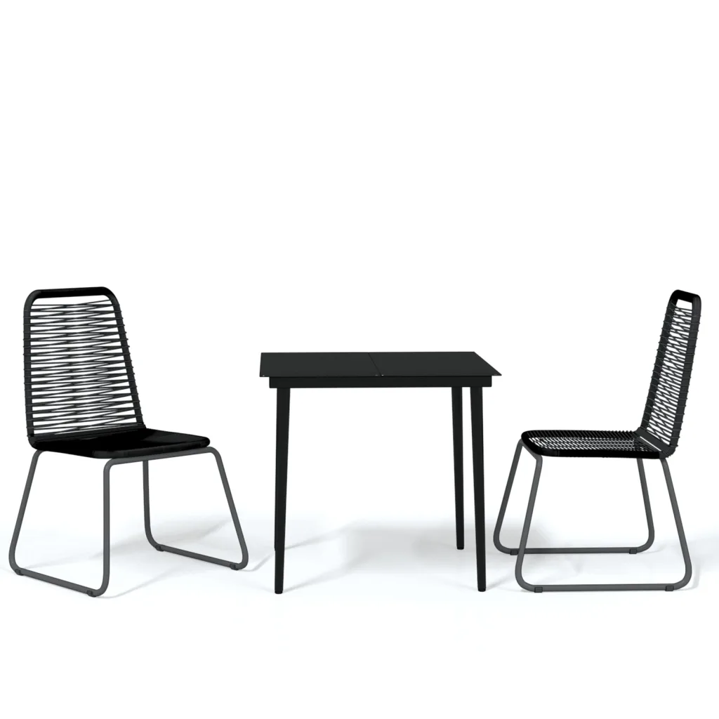 See 3-osaline must aiamööbli komplekt on praktiline lahendus väiksema aia- või terrassinurga sisustamiseks. Komplektis on klaasplaadiga laud ja kaks PE-rotangist tooli, mille pulbervärvitud terasraamid tagavad stabiilsuse ja sobivuse igapäevaseks välistingimustes kasutamiseks.