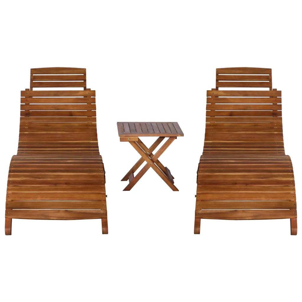 See 3-osaline lamamistoolide komplekt teelauaga loob hubase puhkenurga aeda, terrassile või basseini äärde. Vastupidavast akaatsiapuidust naturaalõliviimistlusega</strong valmistatud päevitustoolid ja külglaud sobivad hästi õues kasutamiseks ning kokkupandav konstruktsioon</strong aitab ruumi säästa, kui komplekti parasjagu ei kasutata.