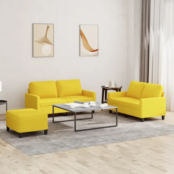 See 3-osaline diivanikomplekt loob elutuppa hubase koha, kus vestelda, lugeda või telerit vaadata. Kaks kahekohalist diivanit ja eraldi jalapink pakuvad piisavalt kohti istumiseks ja jalgade puhkamiseks, samal ajal kui helekollane toon muudab ruumi visuaalselt avatumaks ja rõõmsamaks.