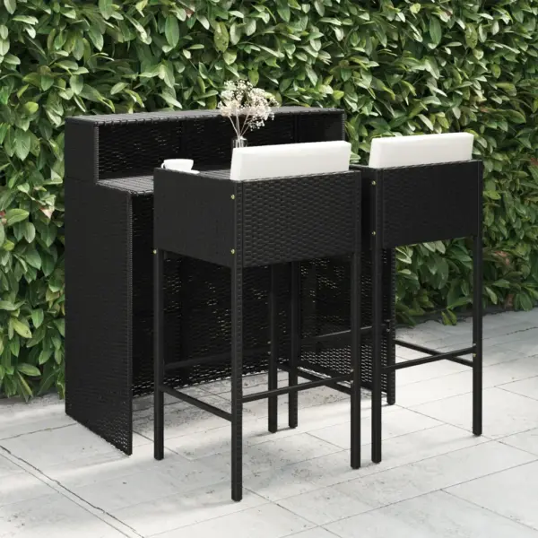 See 3-osaline must aiabaari komplekt sobib terrassile või aeda, pakkudes mugava koha joogipausideks ja vaba aja veetmiseks. Ilmastiku- ja veekindel PE-rotang ning tugev terasraam tagavad, et komplekt talub igapäevast kasutust välitingimustes.