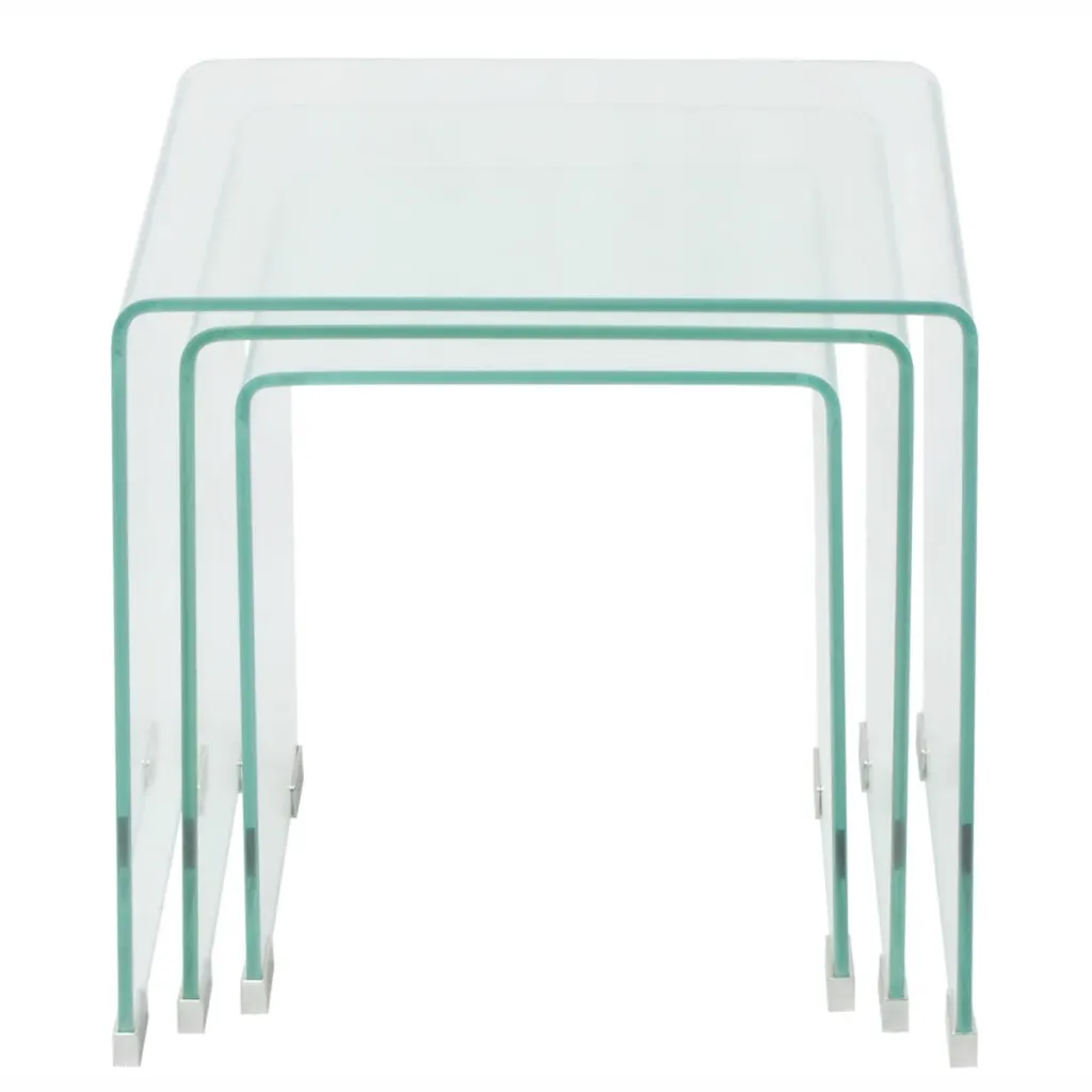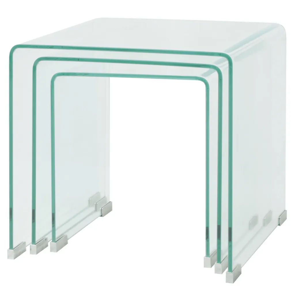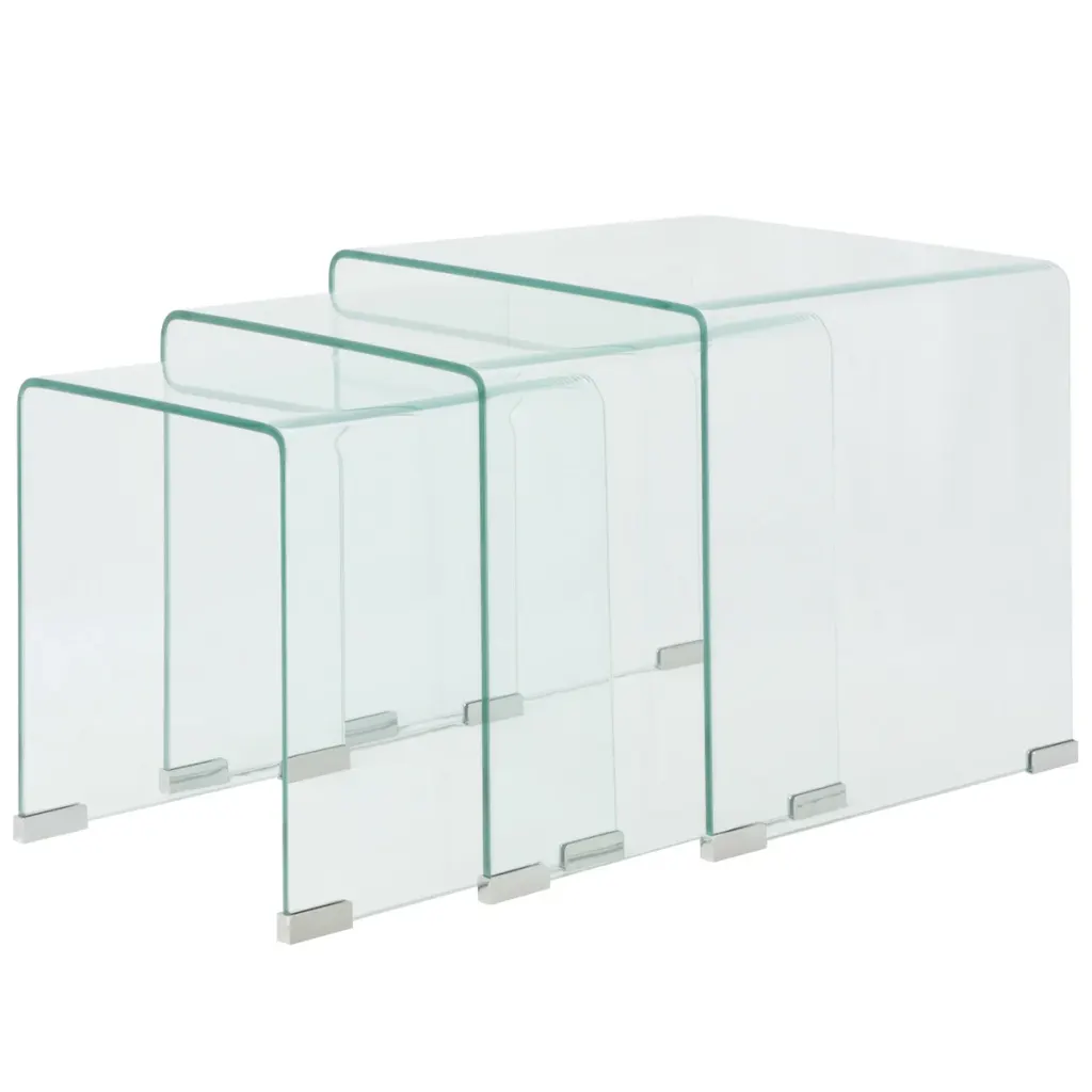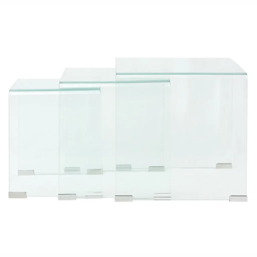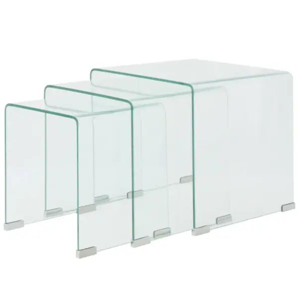 See 3-osaline pesastatav karastatud klaasist abilauakomplekt on praktiline lahendus elutuppa või magamistuppa, kus iga ruutmeeter loeb. Erineva suurusega läbipaistvad lauad pakuvad lisapinda jookide, raamatute ja dekoratsioonide jaoks ning mahuvad kasutuseta olles mugavalt üksteise alla, aidates hoida interjööri visuaalselt õhulisena.