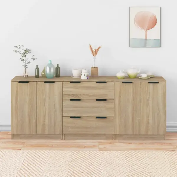 See 3-osaline puhvetkapp sonoma tamme toonis ühendab minimalistliku välimuse ja praktilise hoiuruumi. Tehispuidust korpused on sileda pinnaga ning sobivad hästi elutuppa, söögituppa või esikusse, aidates hoida igapäevased esemed silma alt ära ja ruumi korrastatuna.