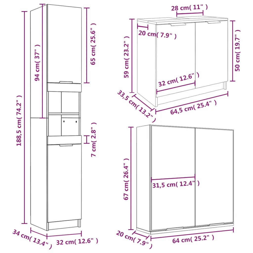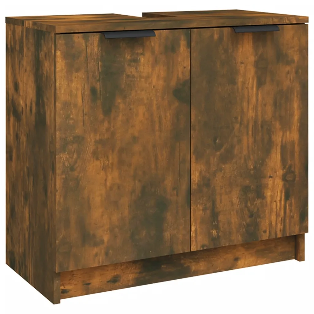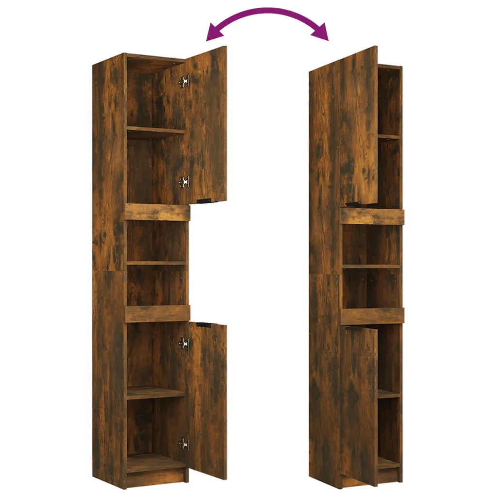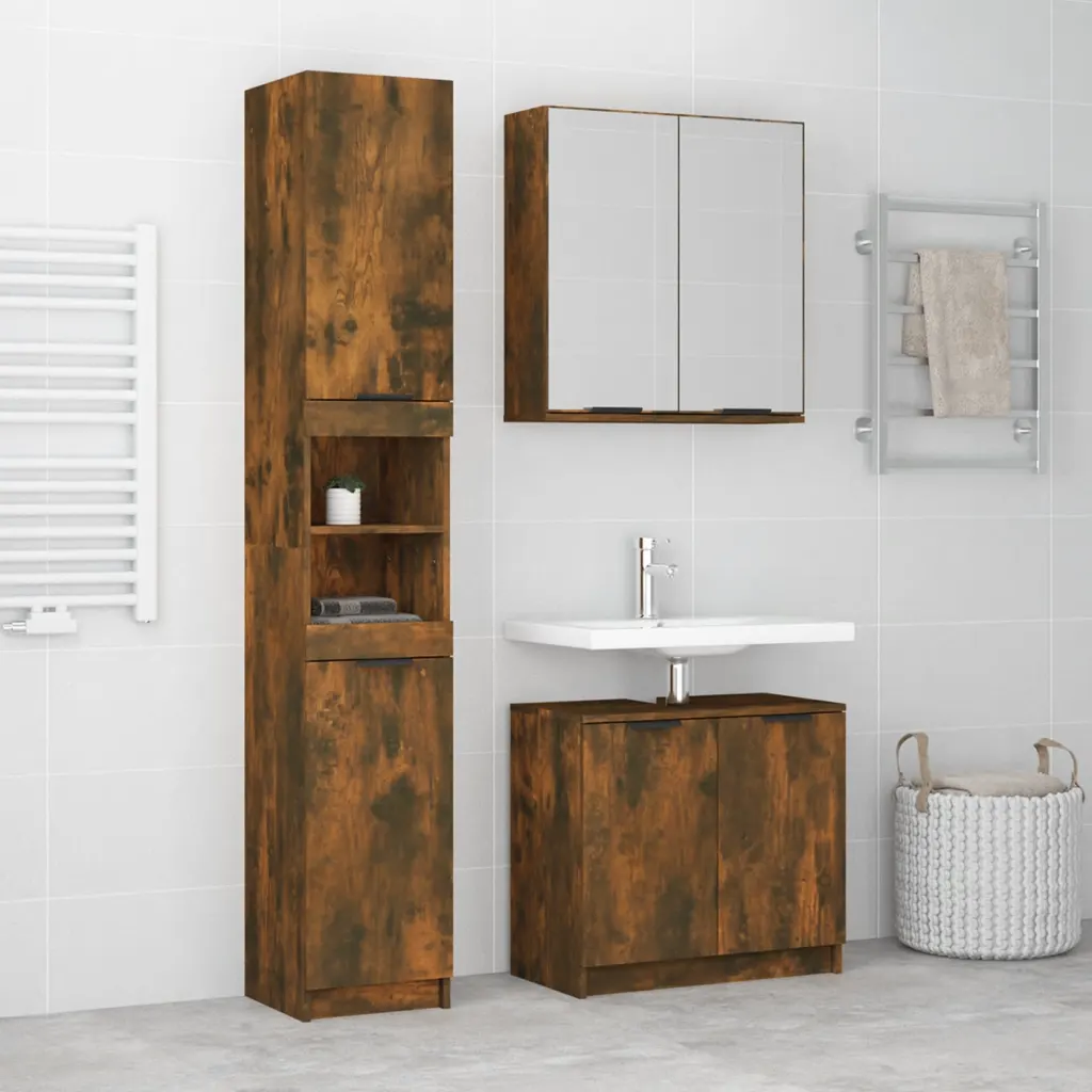 See 3-osaline vannitoakappide komplekt suitsutatud tamme toonis aitab hoida vannitoa asjad korras ning loob ühtse ja modernse ilme. Niiskuskindlast tehispuidust ja klaasist kapid pakuvad praktilist hoiuruumi igapäevaselt kasutatavatele tarvikutele.