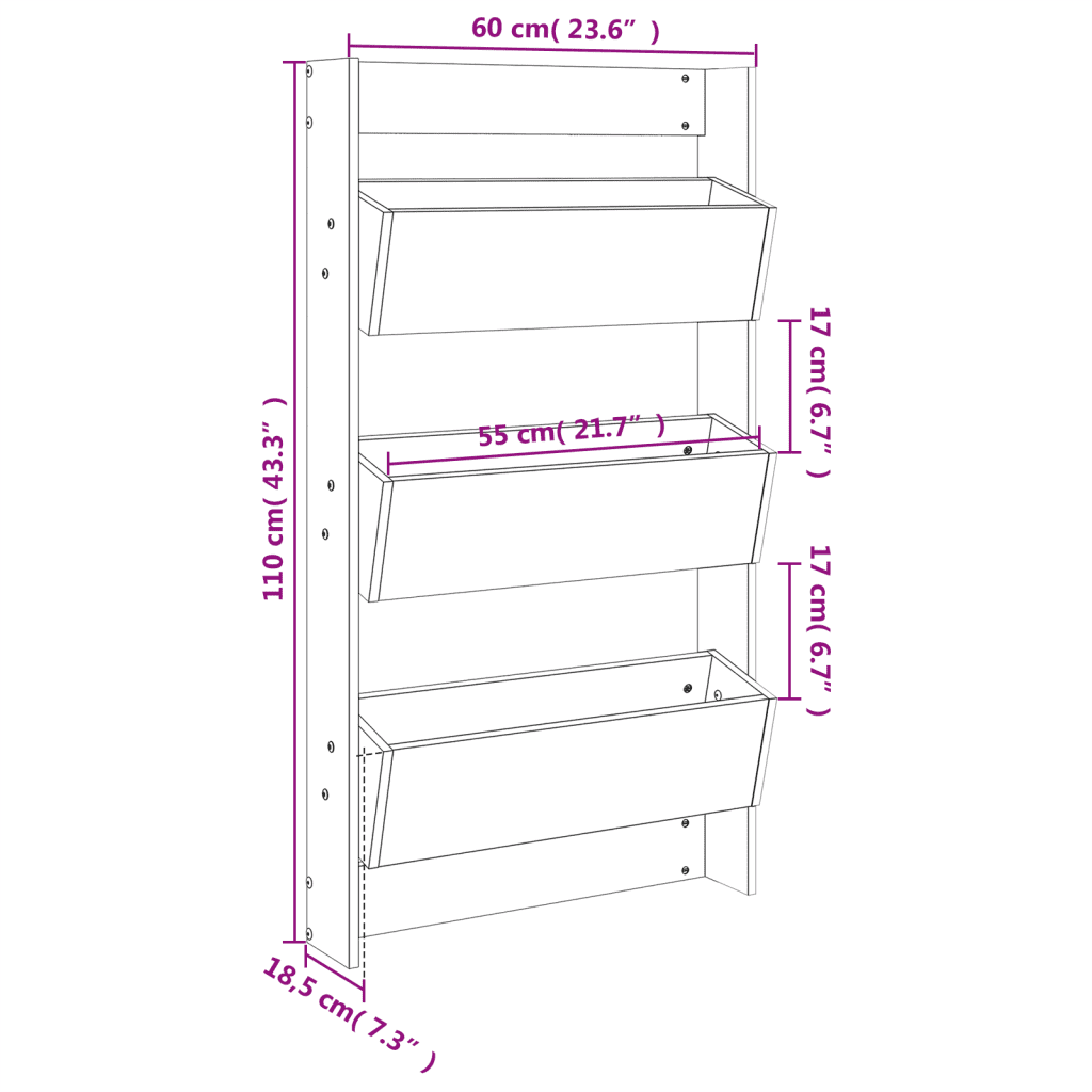 3-tasandiline seinale kinnitatav taimekast aitab väikese rõdu, terrassi või aia seina tõhusalt haljastada ja korrastada. Vertikaalne paigutus säästab põrandapinda, pakkudes samas rohkelt istutusruumi köögiviljadele, maitsetaimedele ja lilledele. Vastupidav mustaks viimistletud männipuidust konstruktsioon sobib hästi kasutamiseks eri välialadel.