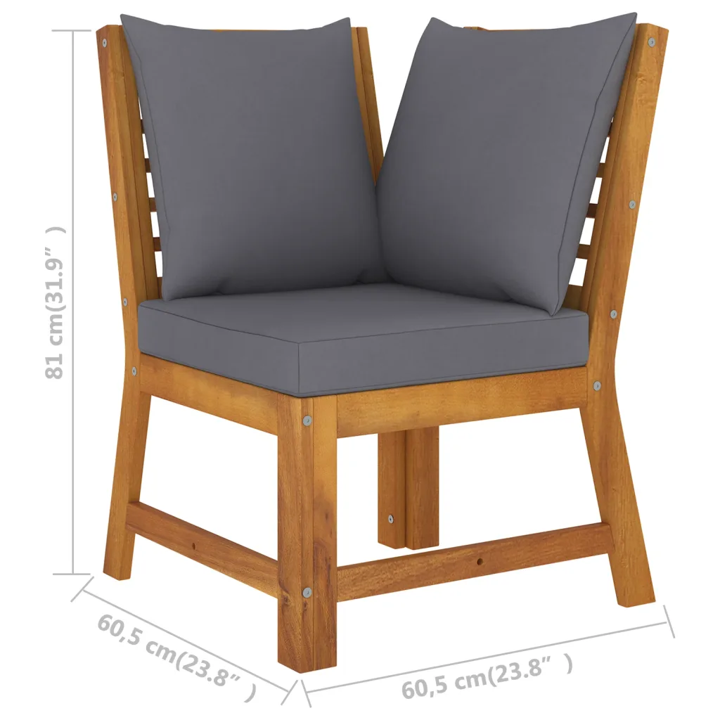 See 4-osaline aiadiivanikomplekt loob mugava ja stiilse istumisnurga teie aeda, rõdule või terrassile. Vastupidavast õliviimistlusega akaatsiapuidust valmistatud raam talub kasutamist õues, tumehallid paksud istme- ja seljatoepadjad lisavad istumismugavust ning ilmastikukindel lahendus vajab vaid vähest hooldust.