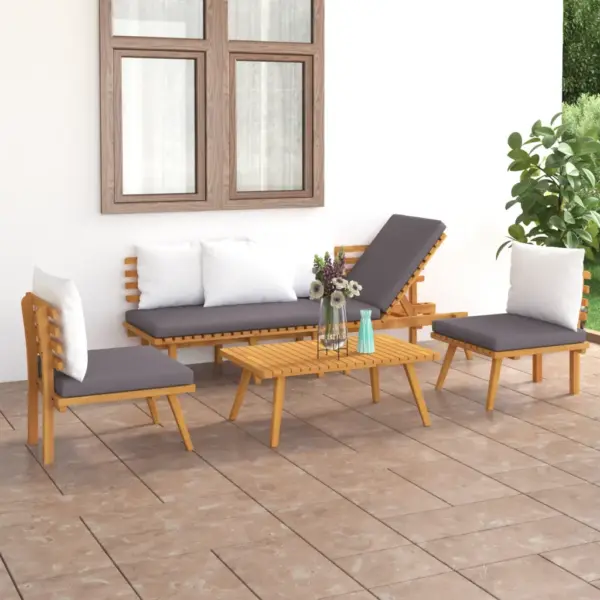 See akaatsiapuidust 4-osaline aiamööbli komplekt ühendab vastupidava materjali, reguleeritava päevavoodi ja paksud pehmendused, et luua mugav väline istumisala. Kui soovid oma terrassile või aeda harmoonilist ja praktilist lahendust, mis sobib nii igapäevaseks kasutamiseks kui ka külaliste võõrustamiseks, on see komplekt asjalik valik.