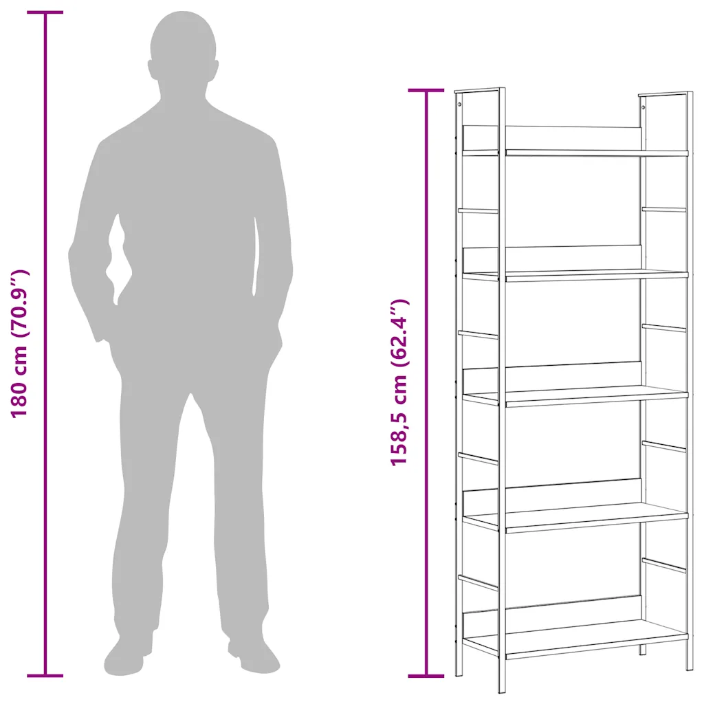 See 5-korruseline must raamaturiiul aitab hoida raamatud, taimed ja dekoratsioonid korrapäraselt ühes kohas. Kompaktne 60 x 27,6 x 158,5 cm disain sobib hästi väiksematesse elutubadesse, töötubadesse või rõdule, pakkudes samas küllaldaselt hoiuruumi. Industriaalstiilis terasraam ja tehispuidust riiulipinnad loovad lihtsa ja ajatu ilme, mis sobitub erinevate interjööridega.