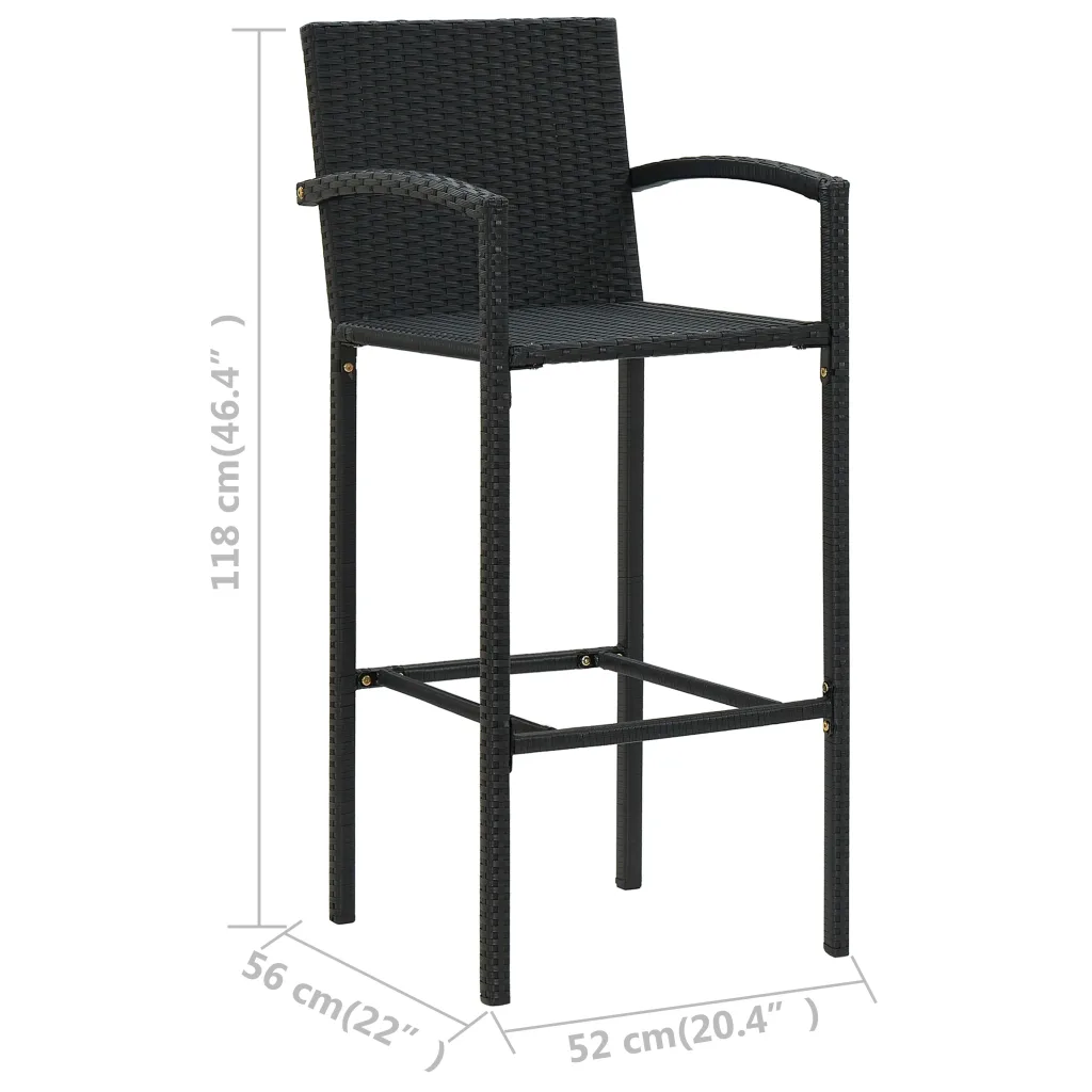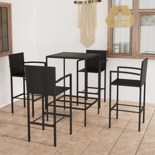 See 5-osaline aiabaari komplekt aitab luua aeda või terrassile kompaktse baarinurga, kus nautida jooke ja suupisteid pere ning sõpradega. Mustast PE-rotangist ja pulbervärvitud terasest valmistatud laud ja pingid on mõeldud kasutamiseks õues, karastatud klaasist lauaplaat on lihtsasti puhastatav. Kõrged pingid seljatoe, käetugede ja sisseehitatud jalatoega pakuvad istumisel lisamugavust.