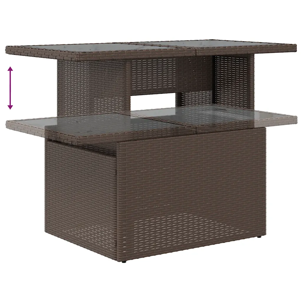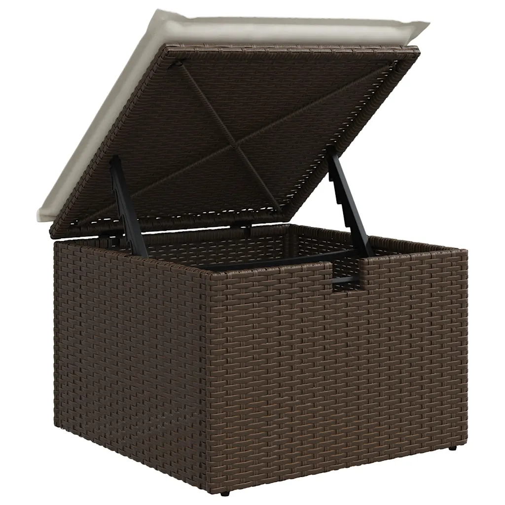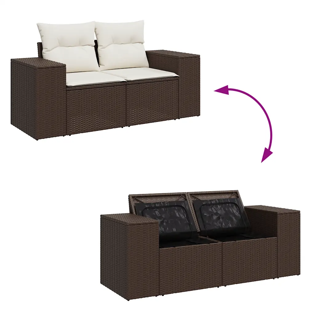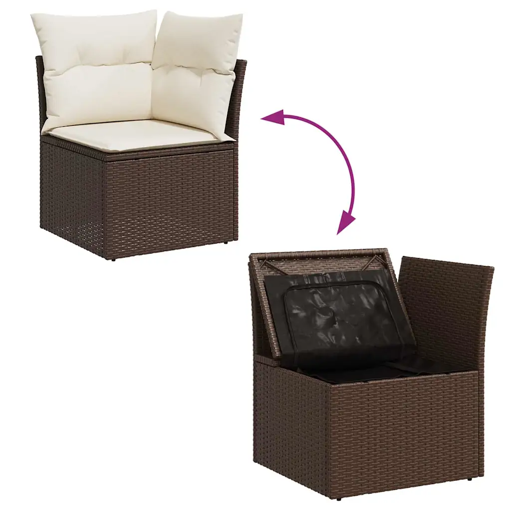 See 5 osaline aiamööbli komplekt loob terrassile, aeda või rõdule mugava istumisnurga, kus on ruumi nii lõõgastumiseks kui ka einestamiseks. Pruunist polürotangist moodulid sobituvad erinevate väliruumidega, kreemvalged diivanipadjad lisavad hubasust ja istmete alla peidetud mahukad hoiukastid aitavad hoida padjad ja muud tarvikud kuivad ning korras.