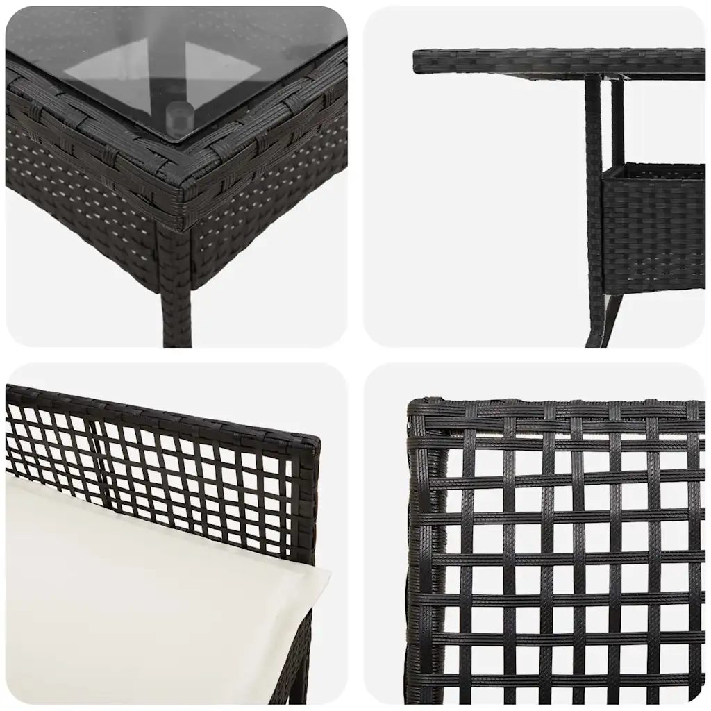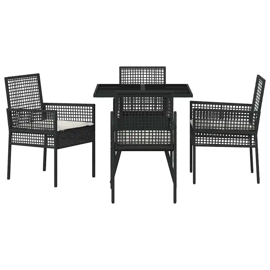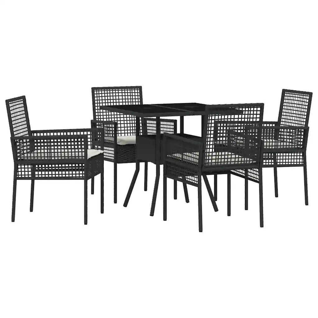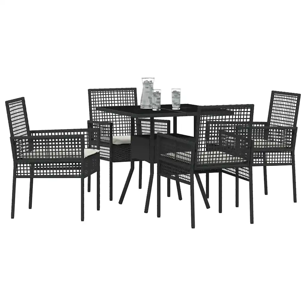 See 5-osaline aiamööbli komplekt loob meeldiva söögiala igale terrassile, rõdule või aeda. Mustast polürotangist raam on ilmastikukindel, ruudukujuline laud karastatud klaasplaadiga on lihtsasti puhastatav ning pehmed istmepadjad pakuvad mugavat istumist pere- ja sõpruskondadega õues einestamiseks.