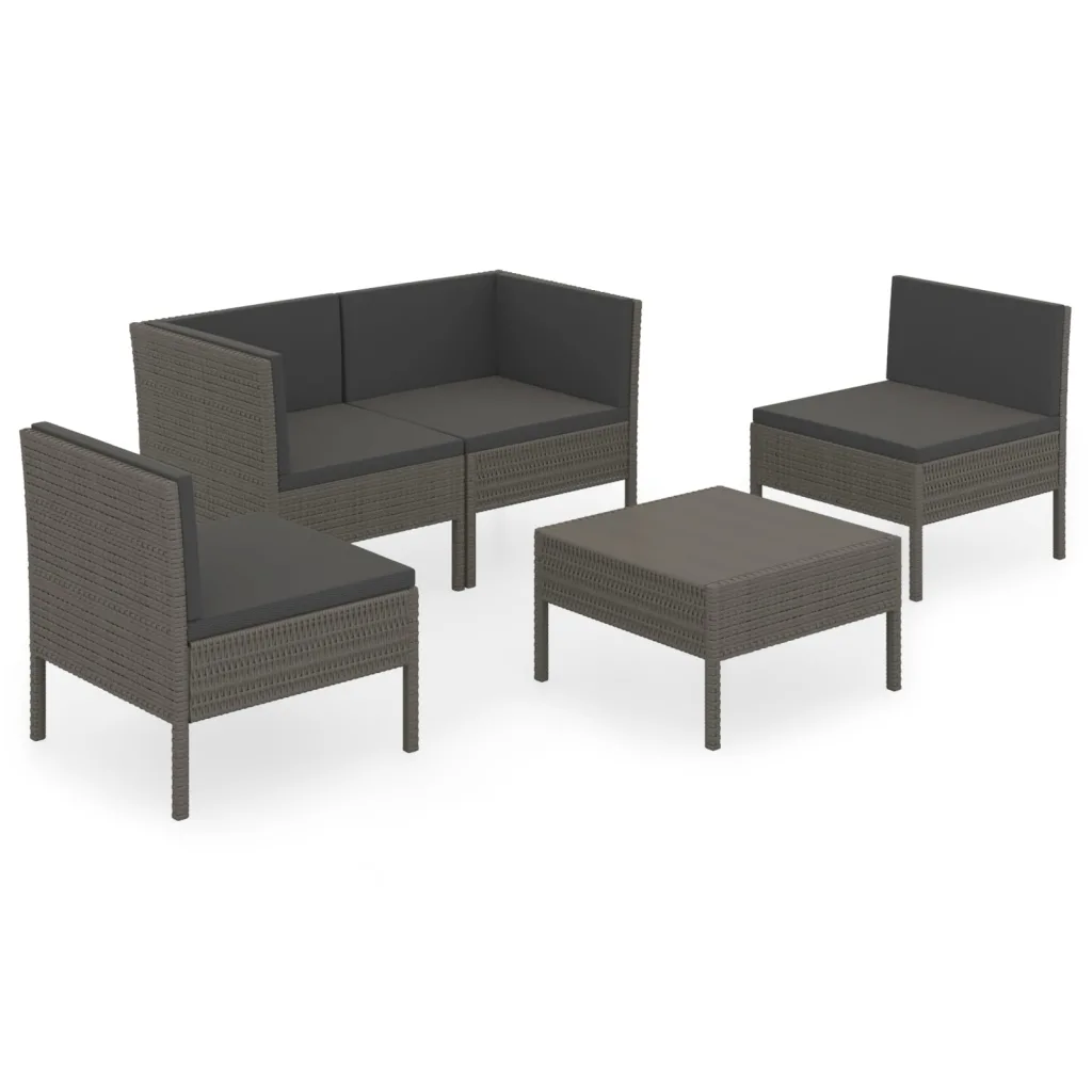 See 5-osaline aiamööbli komplekt aitab luua terrassile, rõdule või aeda hubase istumisala, kus on mõnus pere ja sõpradega aega veeta. Hallist PE-rotangist terrassimööbel koos antratsiitvärvi patjadega sobitub erineva stiiliga väliruumidesse ning pakub mugavat ja funktsionaalset lahendust nii igapäevaseks puhkamiseks kui ka külaliste vastuvõtuks.