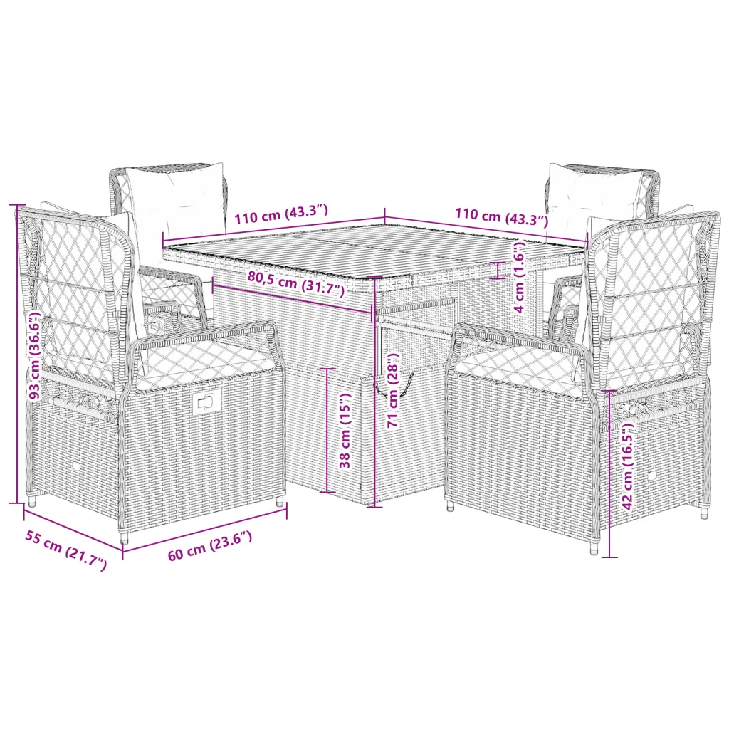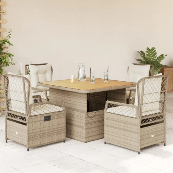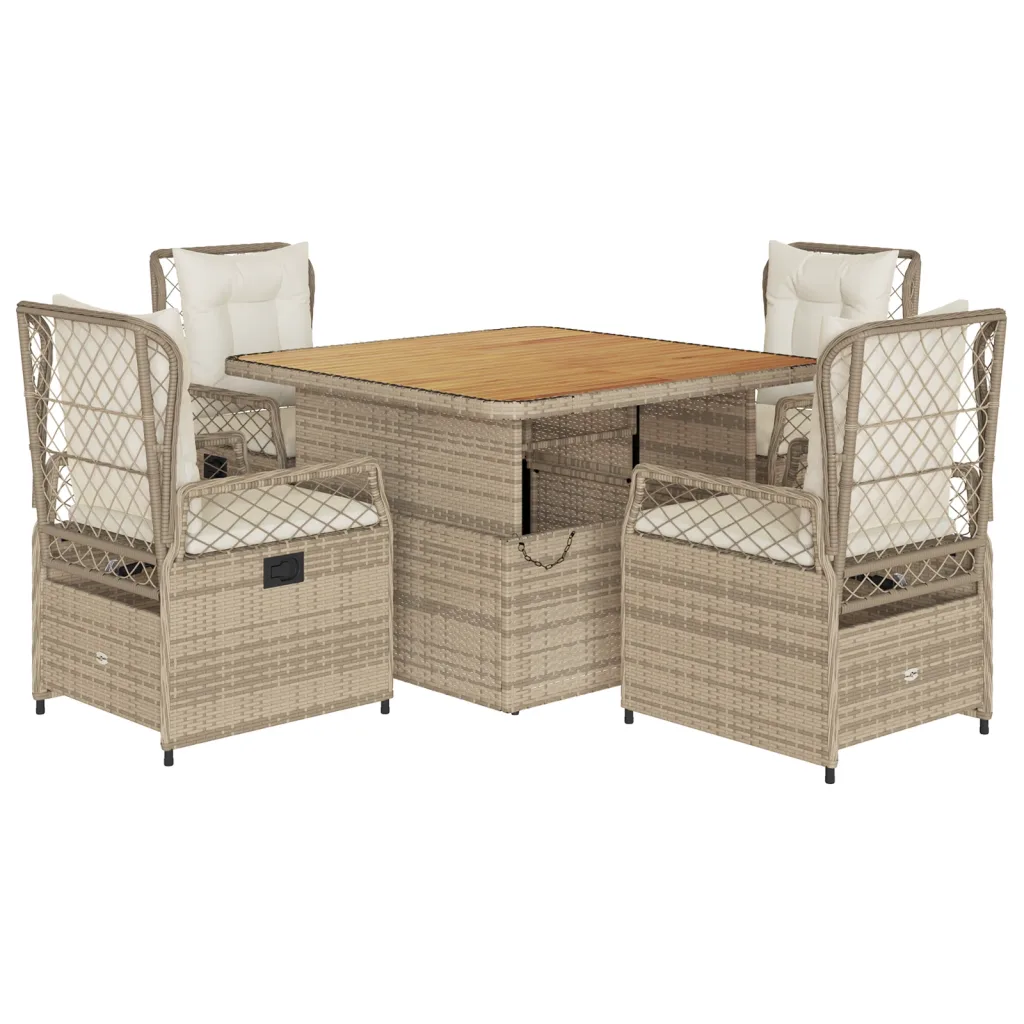 See 5-osaline aiamööbli komplekt patjadega on praktiline lahendus, kui soovite mugavalt värskes õhus einestada või lihtsalt aias, hoovis või terrassil lõõgastuda. Reguleeritava kõrgusega laud ja allalastava seljatoega toolid võimaldavad kiiresti vahetada kohvilaua ümber istumise lõõgastava õhtusöögi või pikema istumise vastu.