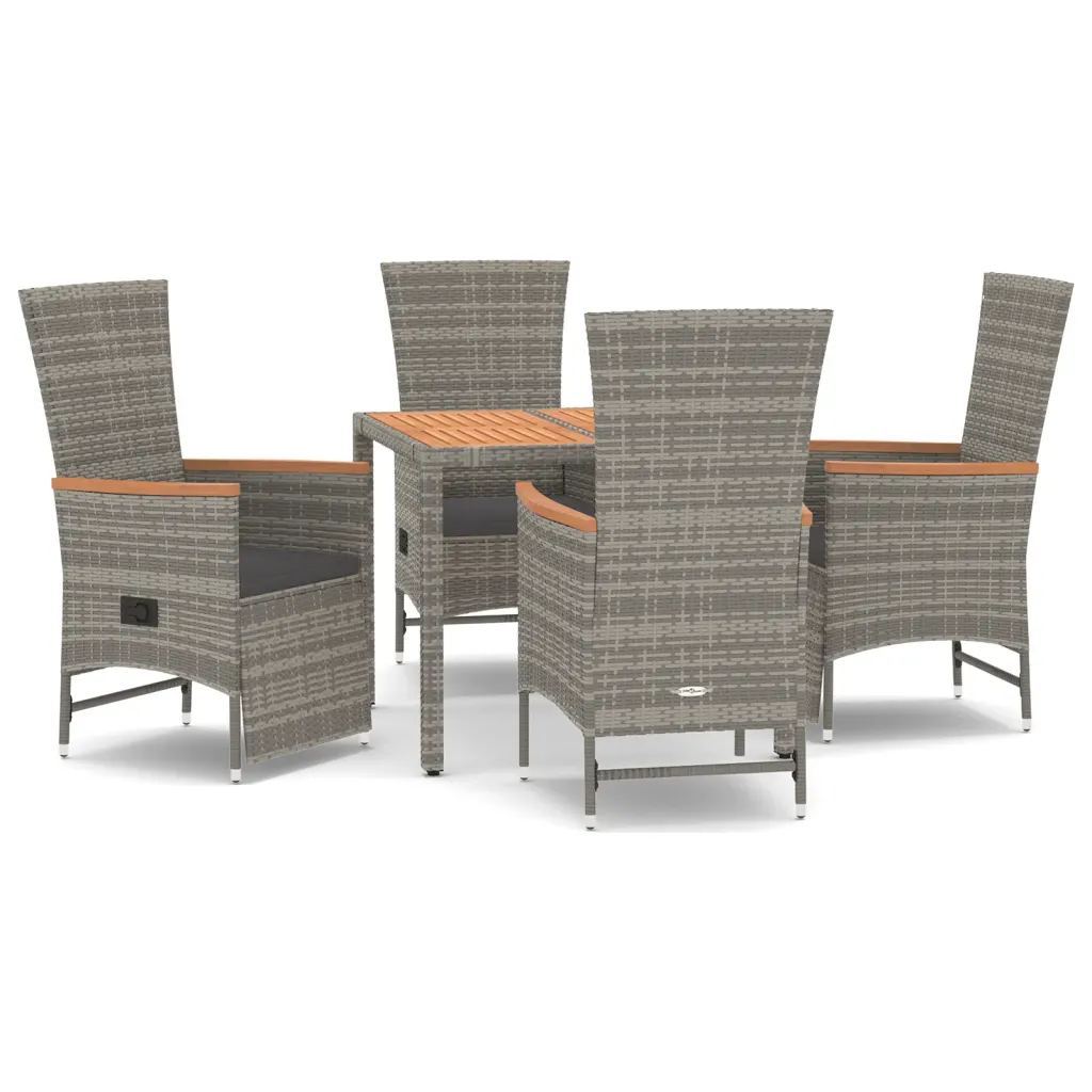 See 5 osaline hall polürotangist aiamööbli komplekt loob terrassile või aeda hubase sööginurga igapäevaseks kasutuseks. Nelja reguleeritava aiatooli ja akaatsiapuidust lauaplaadiga ruudukujuline laud pakuvad mugavat kohta nii einestamiseks kui ka lõõgastumiseks.