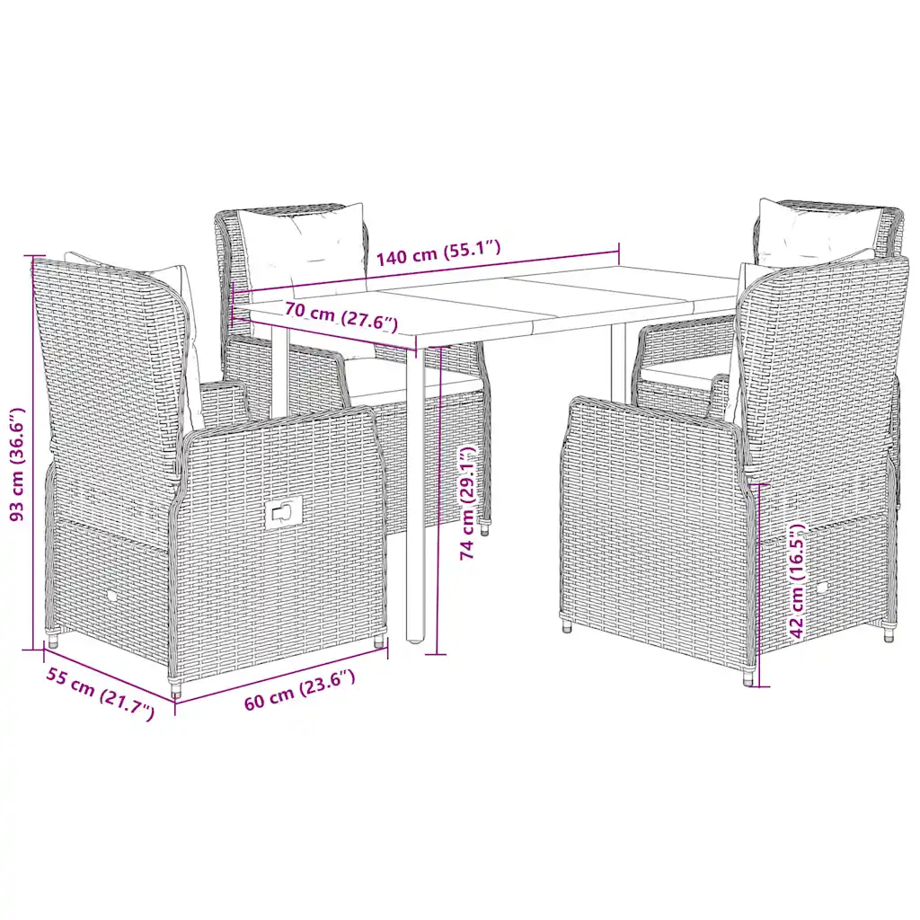 See 5-osaline aiamööbli komplekt on praktiline lahendus, kui soovite mugavalt värskes õhus einestada või lihtsalt aias, hoovis või terrassil lõõgastuda. Musta klaasplaadiga söögilaud ja neli beežist polürotangist aiatooli loovad ühtse ja neutraalse ilme, mis sobitub erinevate väliruumide stiilidega. Pehmed patjad ja reguleeritav seljatugi tagavad mugava istumiskogemuse nii lühemateks pausideks kui ka pikemaks ajaveetmiseks.