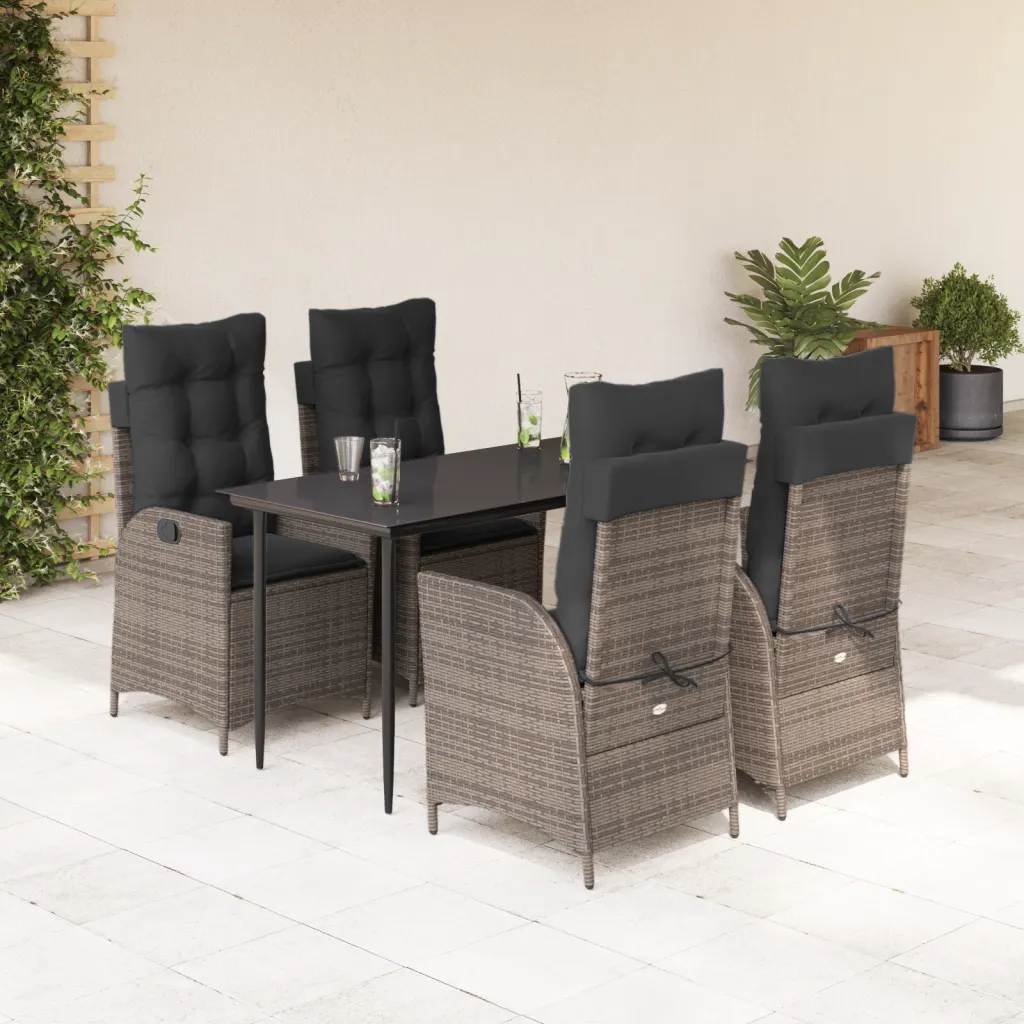 See 5-osaline aiamööbli komplekt loob terrassile, aeda või rõdule mugava söögiala, kus on hea nii igapäevaselt süüa kui ka külalisi võõrustada. Komplektis on üks klaasplaadiga aialaud ja neli reguleeritava seljatoega polürotangist aiatooli pehmete patjadega, mis pakuvad toetavat istumismugavust ja on ühtaegu lihtsasti hooldatavad.