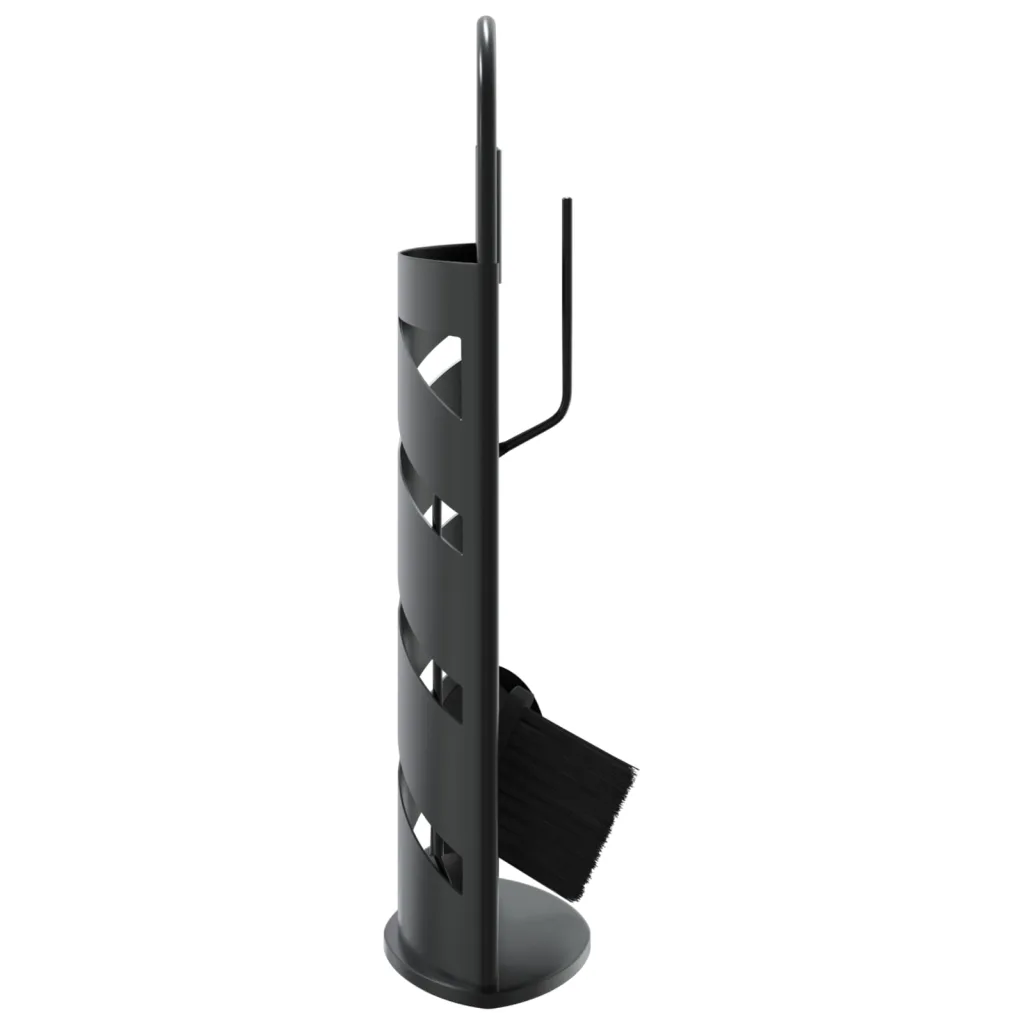 See mustast terasest 5-osaline kaminatööriistade komplekt aitab hoida kamina või ahju ümbruse puhtana ning tööriistad alati käeulatuses. Kompaktne alus mõõtudega 23 x 15 x 66 cm võtab vähe ruumi ja sobib nii elutuppa kui ka maakodusse, pakkudes ühtaegu praktilisust ja tagasihoidlikku dekoratiivset välimust.