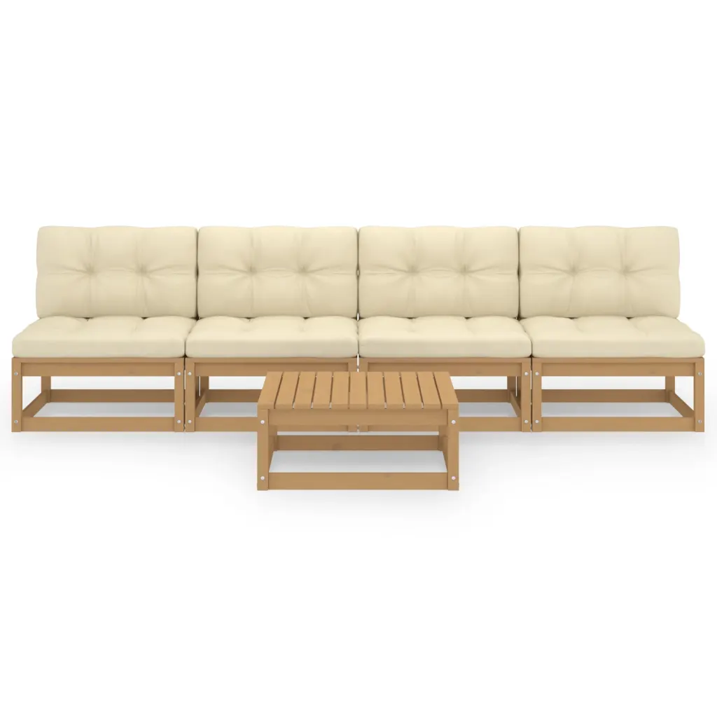 See 5-osaline männipuidust aiamööbli komplekt loob mugava istumisala terrassile, rõdule või aeda. Meekarva täismännipuidust raam ja kreemjad padjad loovad sooja ilme, pakkudes samal ajal hubast kohta puhkamiseks, ilma nautimiseks ja sõpradega aja veetmiseks.