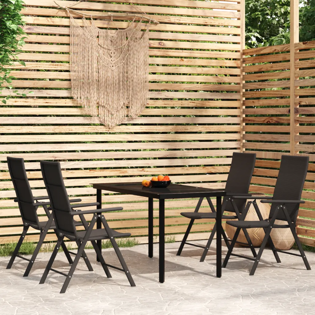 See 5-osaline must aiamööbli komplekt loob aeda või terrassile kutsuva istumisala igapäevaseks einestamiseks ja puhkamiseks. Komplekti kuulub pulbervärvitud terasraamiga klaaslaud ja neli PE-rotangist terrassitooli, mille seljatuge saab reguleerida 7 erinevasse asendisse, et leida endale alati mugav istumisasend.