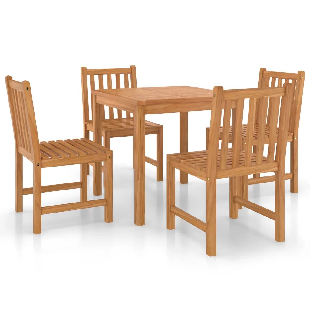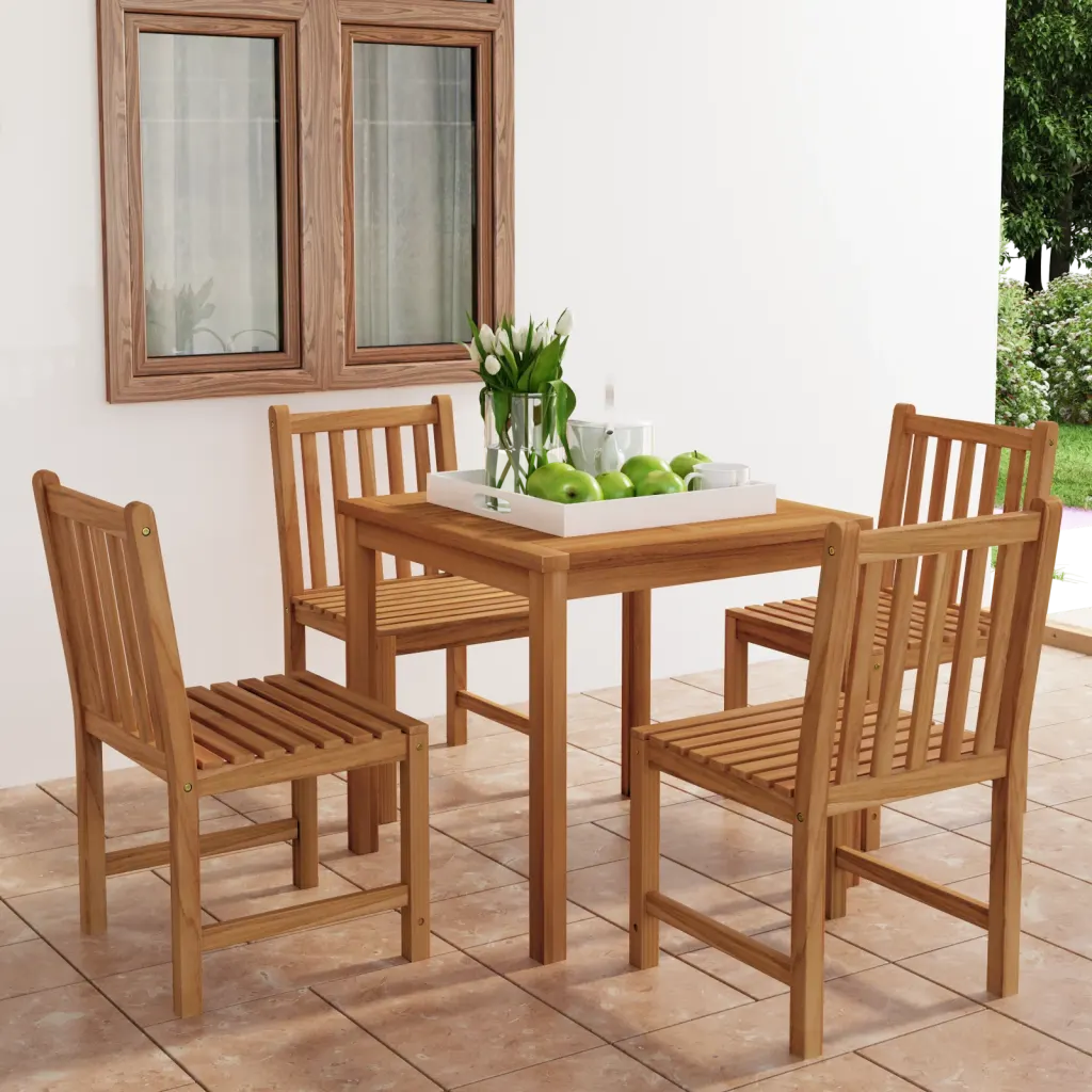 See 5-osaline tiigipuidust aiamööbli komplekt lisab köögile, aiale või siseõuele loomuliku ja sooja ilme. Vee baasil viimistlusega peenelt lihvitud tiigipuit on tugev ja ilmastikukindel, mistõttu sobib komplekt kasutamiseks nii siseruumides kui ka õues. Kompaktne 80 x 80 cm laud ja neli tooli loovad mugava söögikoha pereringis või väiksemateks koosviibimisteks.