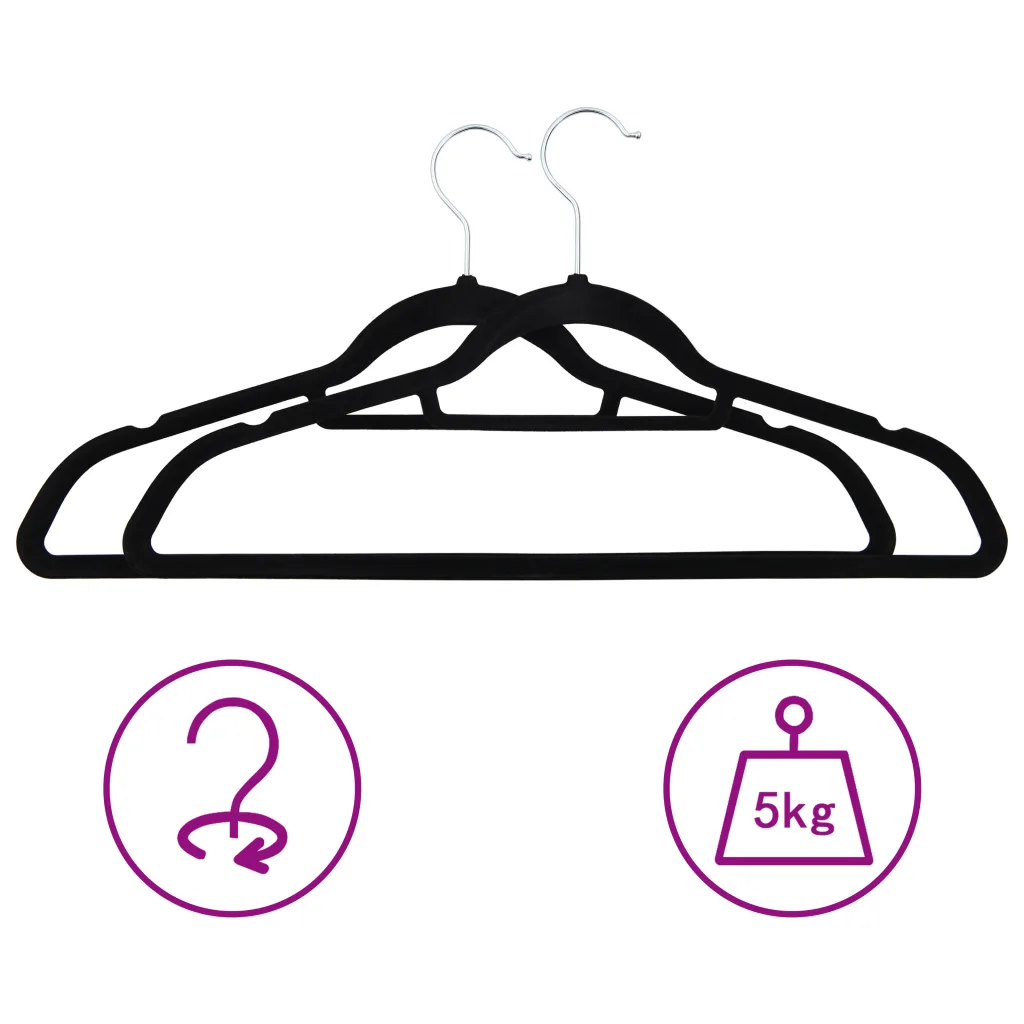 Libisemiskindlad sametkattega riidepuud aitavad hoida sinu garderoobi korras ja rõivaid heas vormis. Tugevast ABS-plastist ja tsinksulamist raam koos musta sametkattega pakub õrna tuge ka õrnadele kangastele. 360° pööratav konks teeb riiete riputamise mugavaks igas kapis ning õhuke profiil säästab hoiuruumi. Komplektis on 50 ühesugust riidepuud, mis sobivad igapäevaseks kasutamiseks nii kodus kui ka garderoobikappides.
