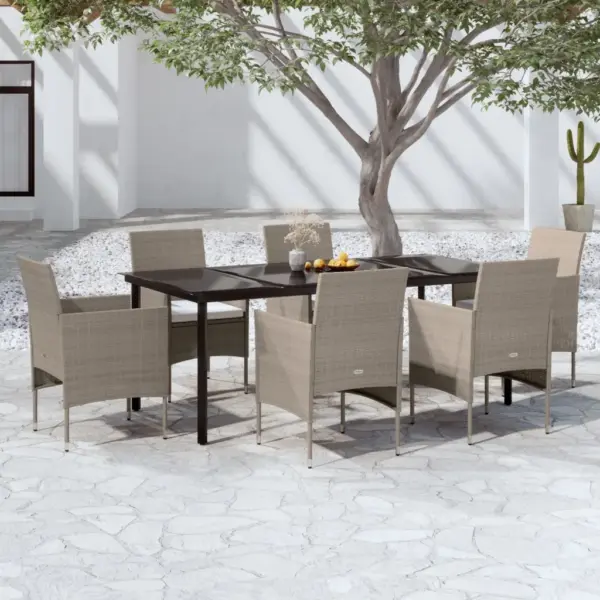 See 7-osaline aiamööbli komplekt patjadega on praktiline lahendus terrassile või aeda, pakkudes mugavat kohta värskes õhus einestamiseks ja ajaveetmiseks. Beeži ja musta värvi kombinatsioon loob neutraalse ja kergesti sobituva ilme, samas kui klaasist lauaplaat annab komplektile modernse viimistluse.