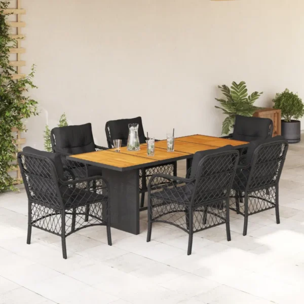 See 7-osaline must aiamööbli komplekt loob aeda, hoovi või terrassile mugava koha, kus pere ja sõpradega värskes õhus einestada või lihtsalt lõõgastuda. UV-kindlast polürotangust toolid, tugev akaatsiapuidust lauaplaat ja pehmed padjad ühendavad vastupidavuse ning kasutusmugavuse igapäevaseks välistingimustes kasutamiseks.