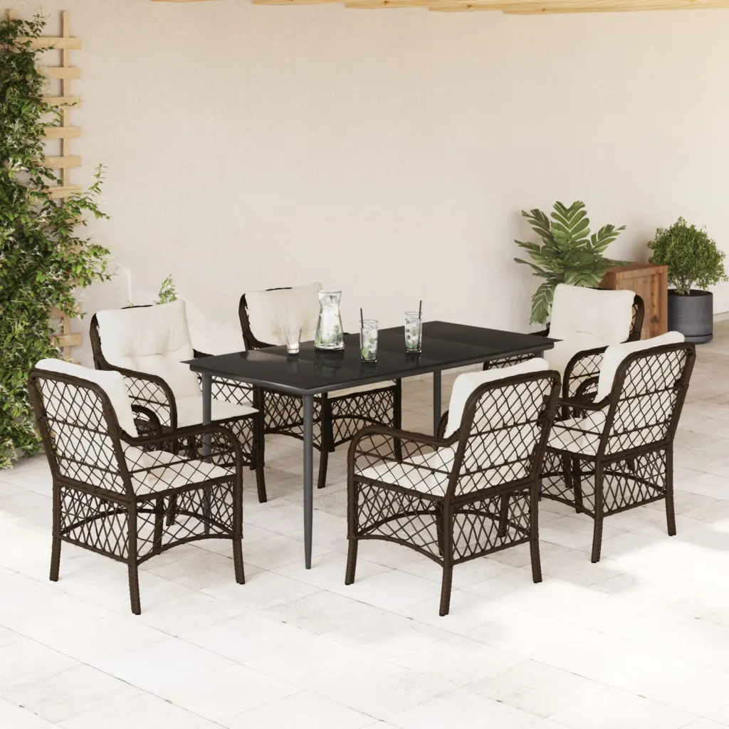 See 7-osaline aiamööbli komplekt loob mugava koha värskes õhus einestamiseks ja puhkehetkedeks aias, hoovis või terrassil. Komplektis on musta karastatud klaasplaadiga laud ja kuus pruuni polürotangist tooli koos pehmete patjadega, mis tagavad lõõgastava istumiskogemuse ning näevad samal ajal UV-kindla materjali tõttu kaua hoolitsetud välja.