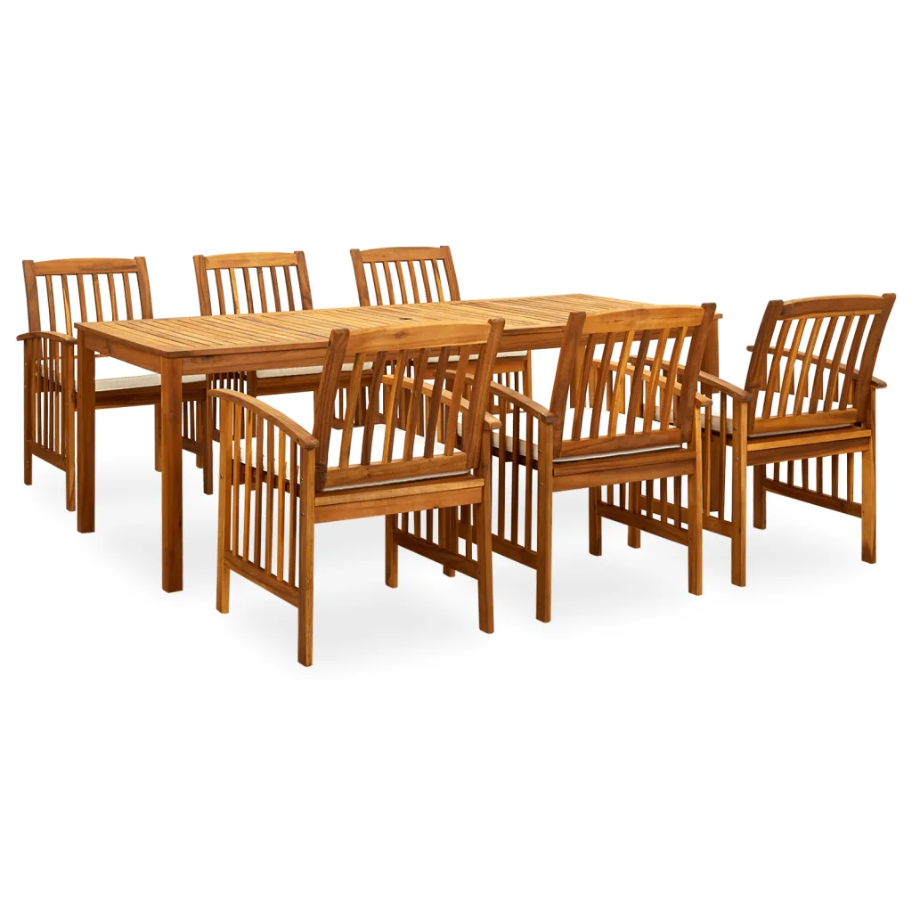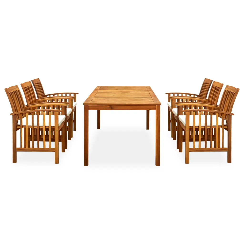 See 7-osaline aiamööbli komplekt muudab sinu aia või terrassi hubaseks söögikohaks perele ja sõpradele. Suur akaatsiapuidust söögilaud ja kuus liistudega tooli koos tihkete kreemvalgete istmepatjadega pakuvad mugavat istumist ning õliviimistlusega puit annab keskkonnale loodusliku ja sooja ilme. Komplekt sobib hästi nii igapäevaseks kasutamiseks kui ka suvisteks aiapidudeks.