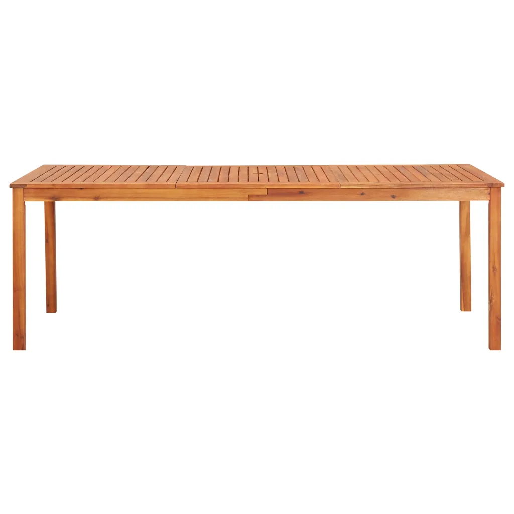 - 1 x söögilaud akaatsiapuidust, mõõtmed 215 x 90 x 74 cm (pikkus x laius x kõrgus), lauaplaadis päevavarju auk
