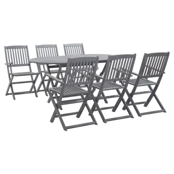 See 7-osaline hall aiamööbli komplekt loob terrassile või aeda praktilise koha pere ja sõpradega söömiseks. Ovaalne akaatsiapuidust laud ja kokkupandavad toolid ühendavad vastupidavuse ning ruumisäästliku hoiustamise. Tänu neutraalsele hallile toonile sobitub komplekt kergesti erinevate väliruumide stiiliga.