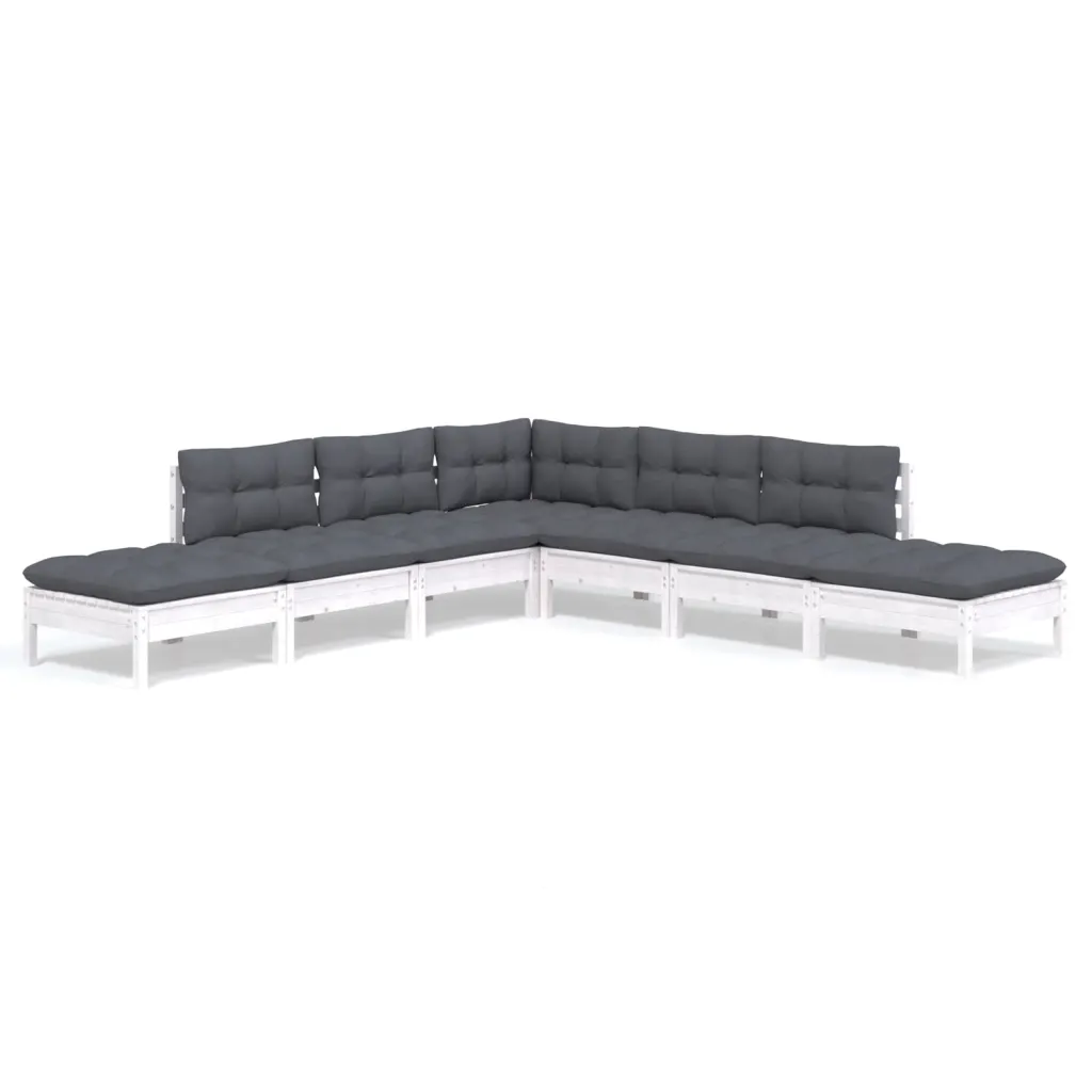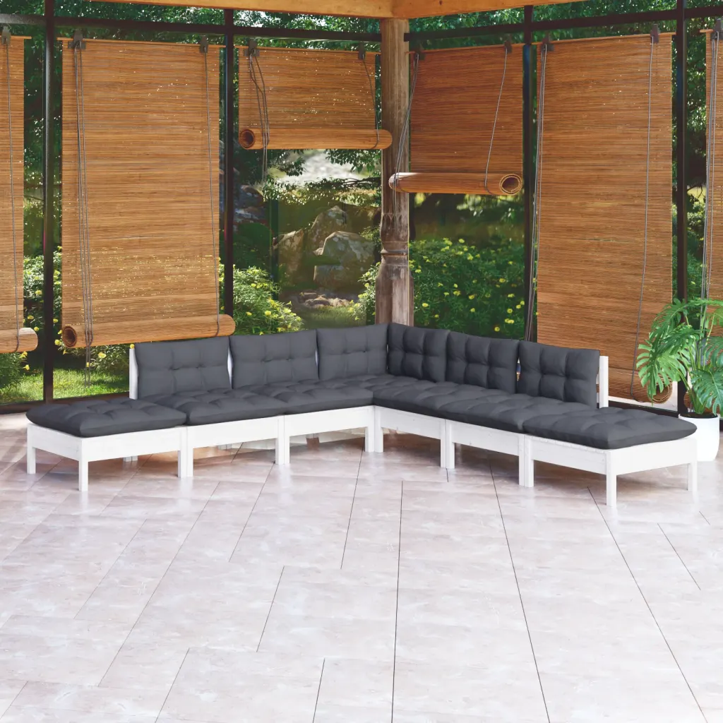 See 7-osaline valge männipuidust aiamööbli komplekt loob mugava istumisala terrassile või aeda pere ja sõpradega ajaveetmiseks. Tugev täismännipuit ja antratsiithallid polüesterpadjad moodustavad praktilise lahenduse puhkamiseks, ilma nautimiseks ja tukastamiseks.