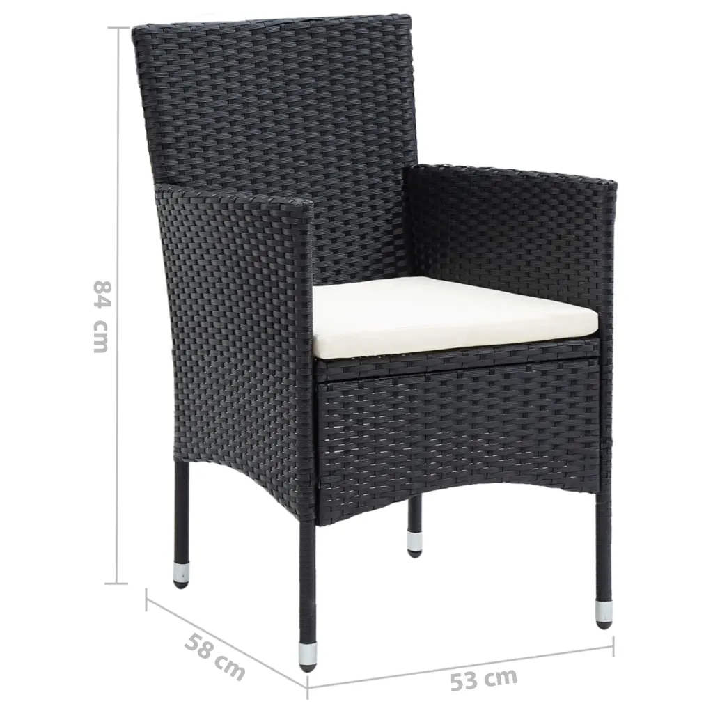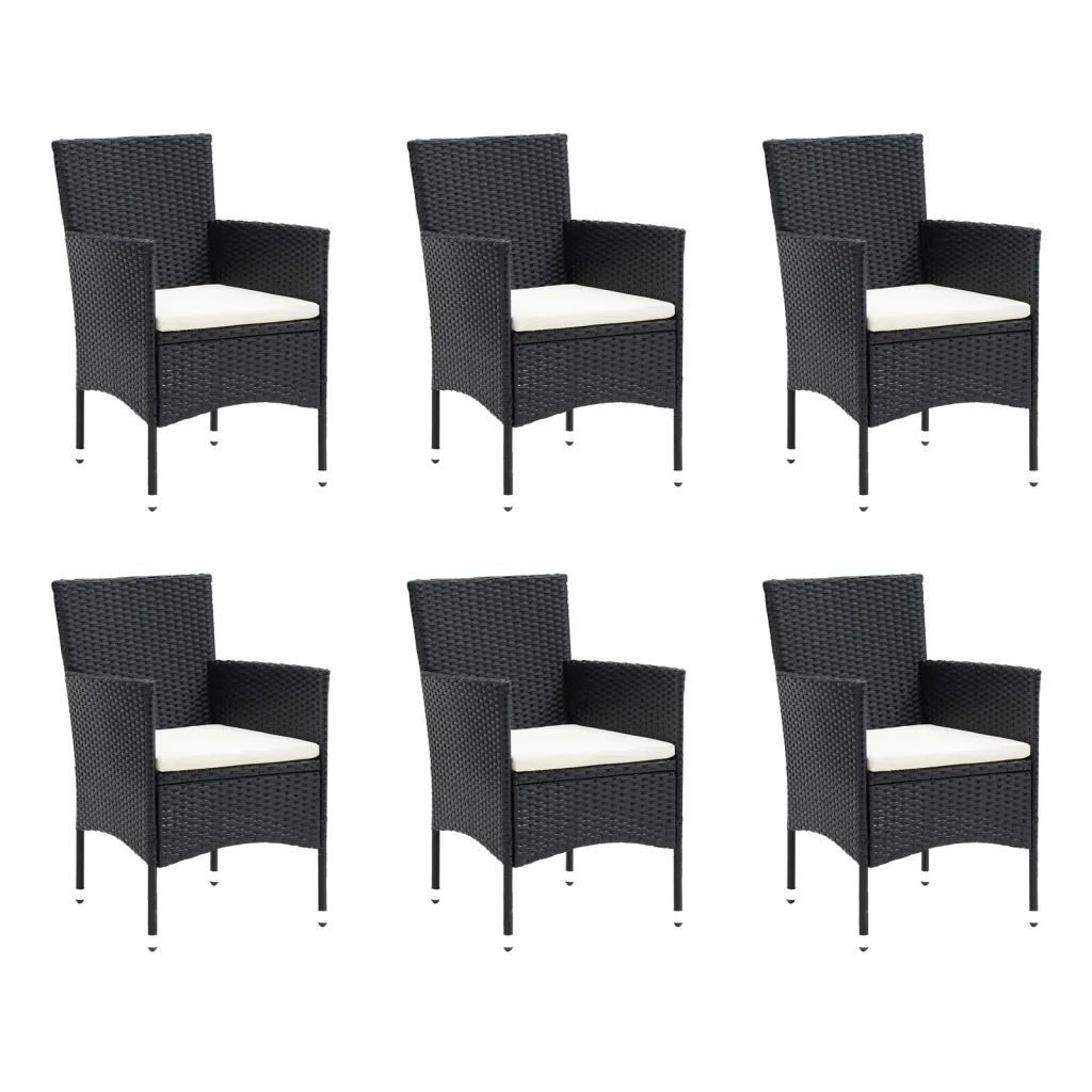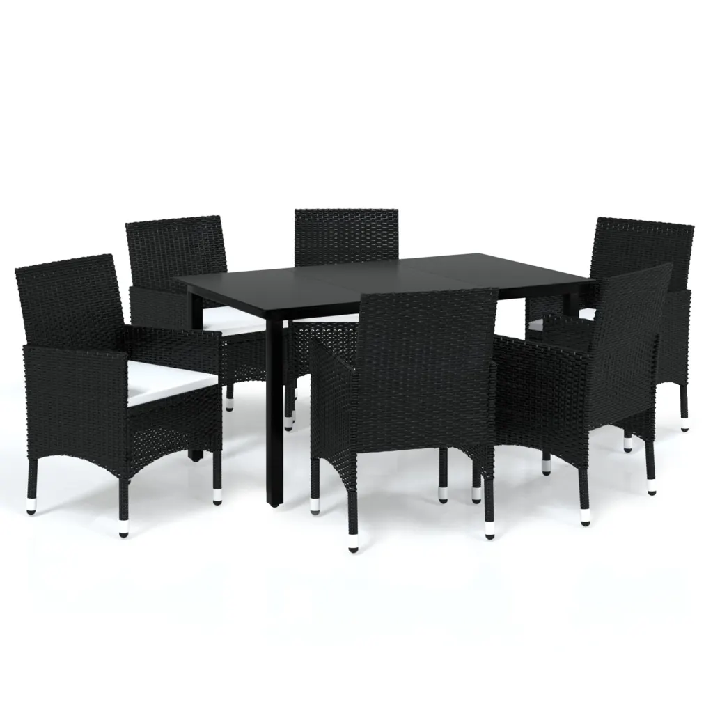 See 7-osaline aiamööbli komplekt pakub praktilist ja ühtse stiiliga söögiala aeda, terrassile või rõdule. Mustast ilmastikukindlast PE-rotangist toolid terasraamiga ning alumiiniumraamiga laud klaasist lauaplaadiga on mõeldud välitingimustes kasutamiseks, pakkudes samal ajal mugavust ja lihtsat hooldust. Komplekti kuuluvad kreemjasvalged istmepadjad lisavad istumisel pehmust ja visuaalset kontrasti musta punutisega.