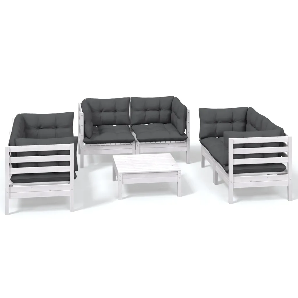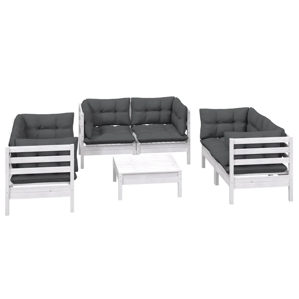 See 7-osaline aiamööbli komplekt loob hubase ja praktilise istumisala aeda, terrassile või rõdule. Komplekt koosneb kuuest nurgadiivanist ja jalatoest/lauast, mis moodustavad mitmekülgse puhkenurga pere ja sõpradega aja veetmiseks. Valge täismännipuidust raam ja antratsiithallid istme- ja seljatoepatjad loovad neutraalse ja kaasaegse ilme, mida on lihtne erineva väliruumiga sobitada.