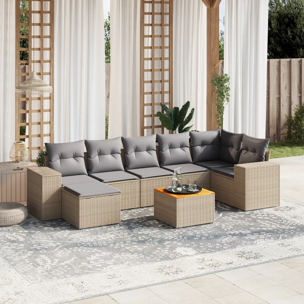 See 8-osaline aiadiivani komplekt loob aias, hoovis või terrassil mugava istumisala, kus on ruumi nii pere kui sõprade jaoks. UV-kindlast polürotangist valmistatud moodulid, akaatsiapuidust lauaplaat ja pehmed helehallid padjad pakuvad praktilist ning samas hubast lahendust välitingimustes lõõgastumiseks. Istmete alla peidetud panipaigad vettpidavate kottidega aitavad hoida patju ja muid esemeid korrastatult ning kaitstult.