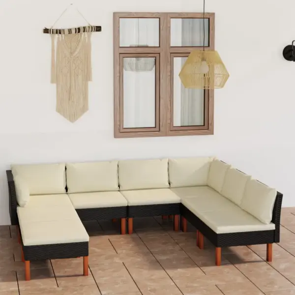 8-osaline aiamööbli komplekt loob terrassile, rõdule või aeda hubase istumisala, kus nautida ilma, puhata või veeta aega pere ja sõpradega. Komplekt on valmistatud mustast PE-rotangist ja pulbervärvitud terasest, mida täiendavad naturaalse õliviimistlusega eukalüptipuidust jalad, pakkudes ühtaegu mugavust ja vastupidavust välitingimustes.