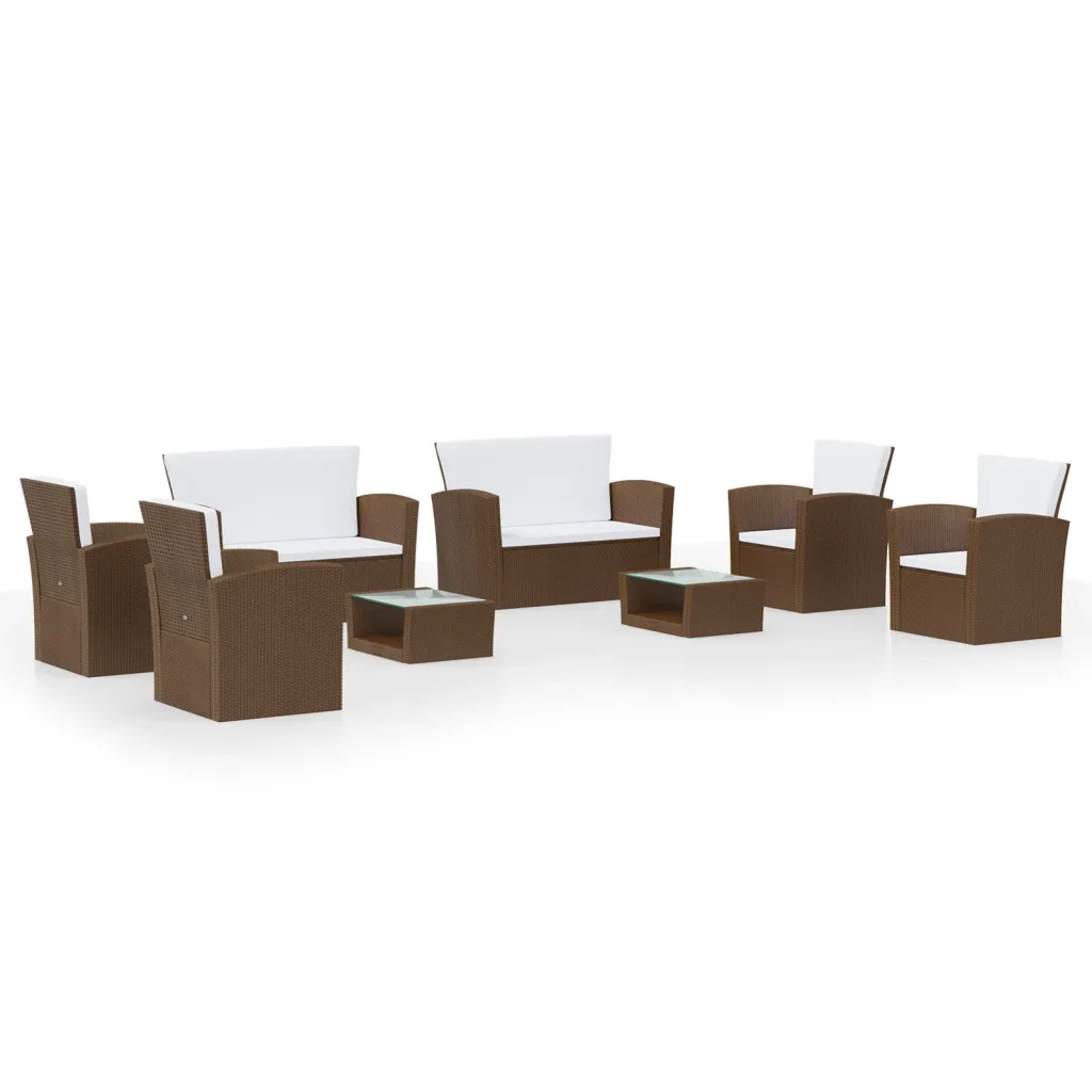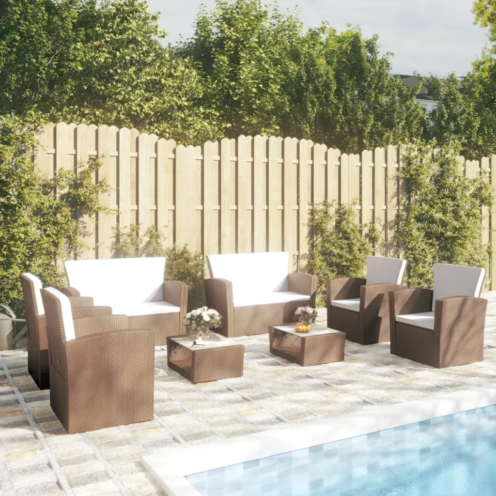 See 8-osaline pruun aiamööbli komplekt patjadega loob rõdule, terrassile või aeda ühtse ja mugava istumisnurgaga puhkeala. Pulbervärvitud terasest raam, PE-rotang ja klaasist lauaplaadid pakuvad vastupidavust igapäevases kasutuses, samal ajal kui paksud pehmendusega padjad tagavad lõõgastava istumismugavuse kuni kaheksale inimesele.