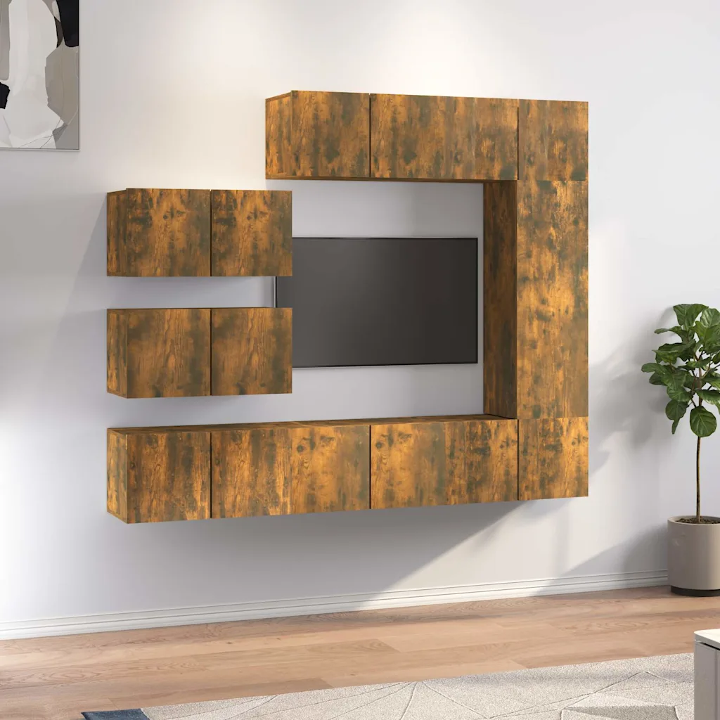 See 8-osaline telerikappide komplekt loob elutuppa ühtse ja modernse panipaigalahenduse, hoides meediaseadmed, kaablid ja tarvikud korrapäraselt silma alt ära. Seinale kinnitatav disain jätab põranda vabaks ja aitab ruumi visuaalselt suuremana hoida, samas kui suitsutatud tamme toon lisab interjöörile sooja ja moodsat ilmet.