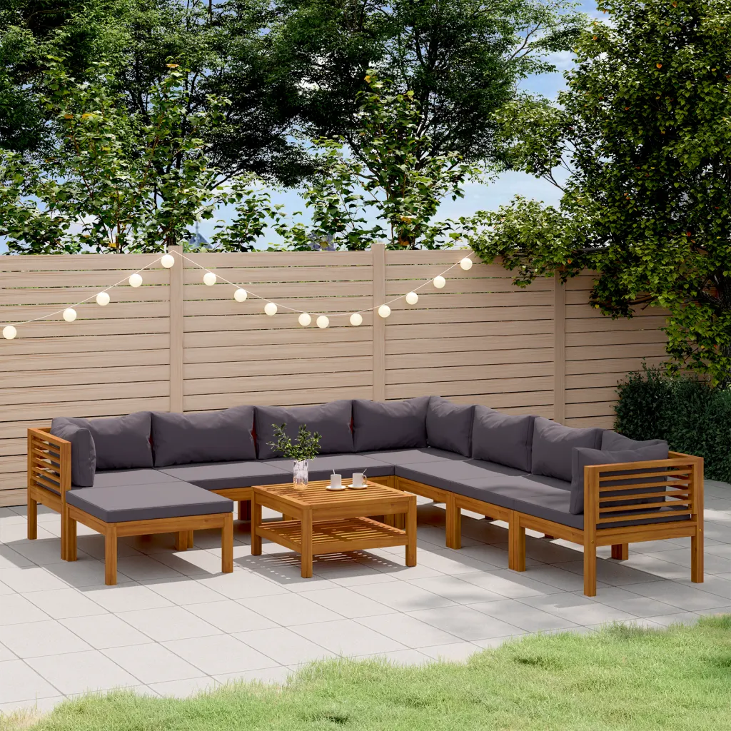 See 9-osaline aiadiivanikomplekt patjadega aitab luua terrassile, aeda või rõdule avara ja mugava istumisala pere ja sõpradega aega veetmiseks. Õliviimistlusega akaatsiapuidust raam on tugev ja vastupidav, tumehallid paksud padjad lisavad hubasust ning tagavad mõnusa istumismugavuse. Modulaarne ehitus võimaldab diivanielemente vastavalt ruumile ümber paigutada ja lahendust hõlpsalt kohandada.