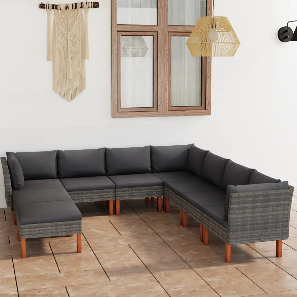 See 9-osaline hall aiamööbli komplekt loob avara ja mugava istumisala terrassile, rõdule või aeda. Ilmastikukindel polürotang, pulbervärvitud terasraam ja eukalüptipuidust jalad moodustavad vastupidava koosluse, paksud istme ja seljatoepadjadega mooduleid saab paigutada vastavalt vajadusele.