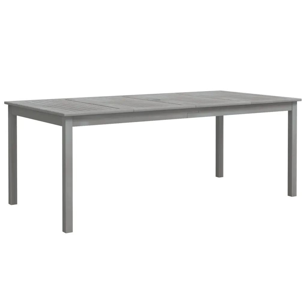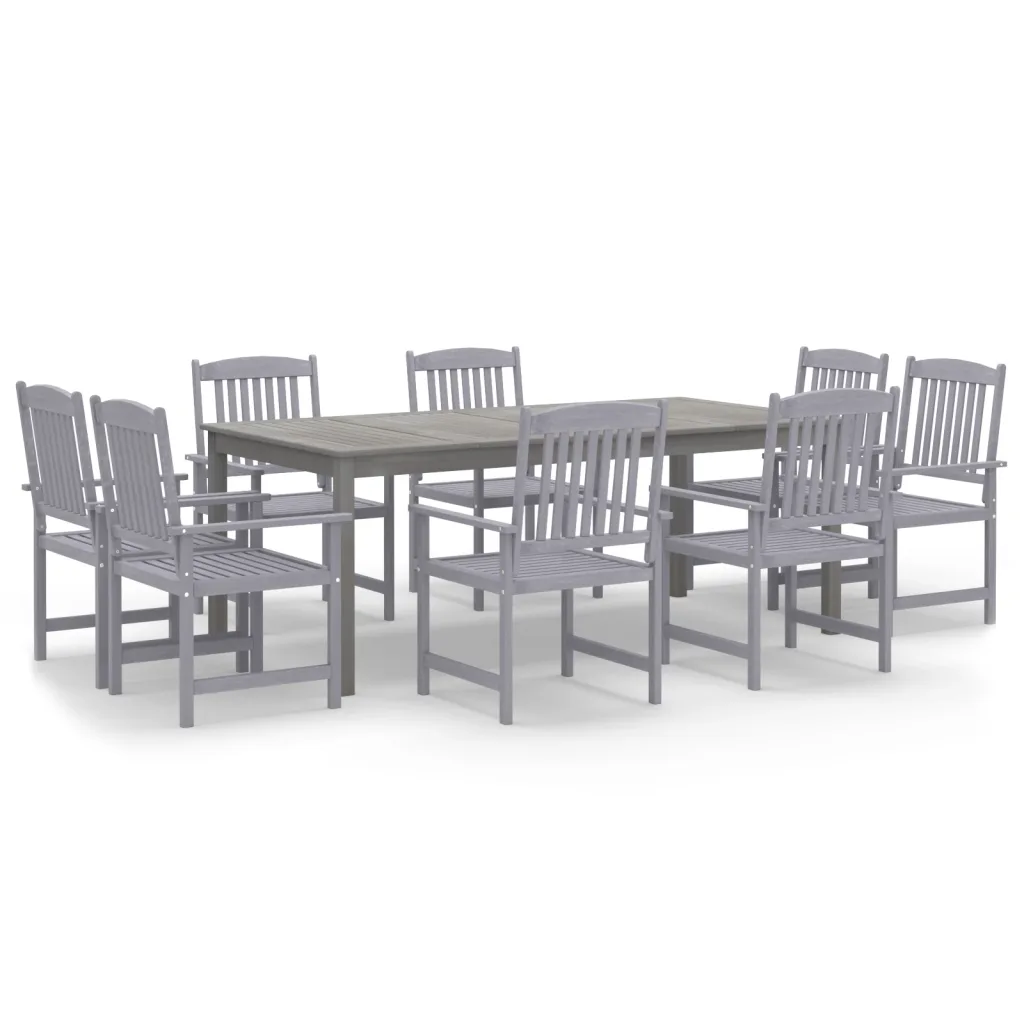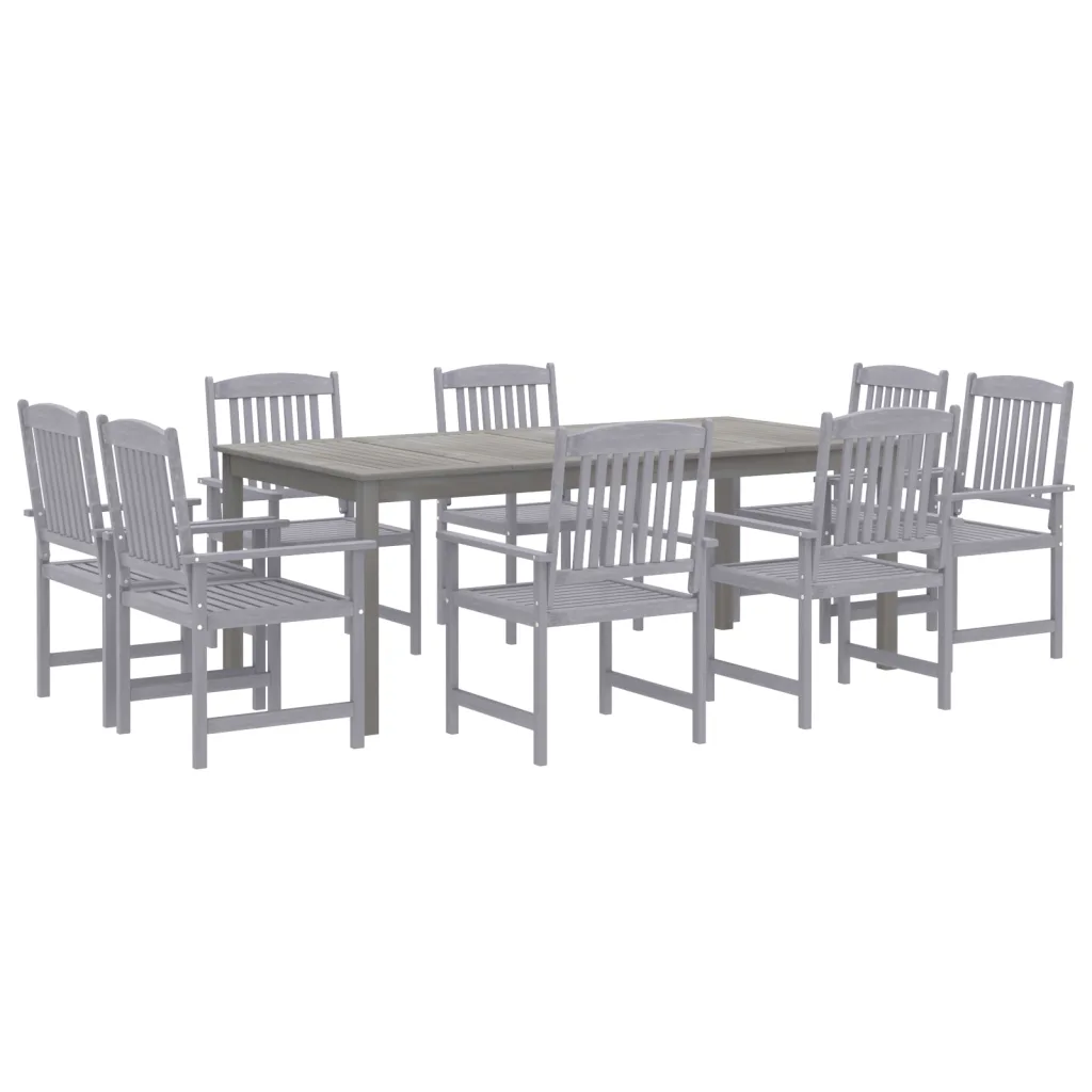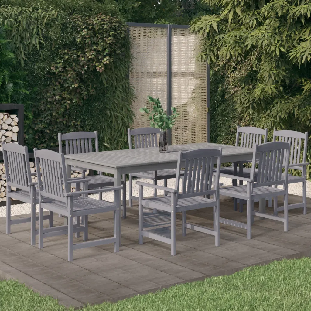 See 9-osaline aiamööbli komplekt loob terrassile või aeda kindla ja mugava söögiala pere- ja sõpruskokkusaamisteks. Õliviimistlusega akaatsiapuit on vastupidav ning hall toon sobitub hõlpsasti eri stiilis õueruumidega. Lai päevavarjuauguga laud võimaldab lisada päikesevarju, et nautida õues olemist nii päikese kui ka kerge vihma korral.